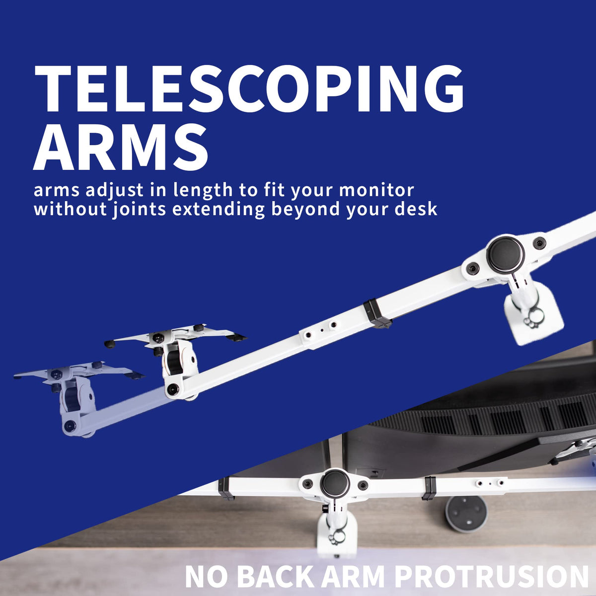 Enjoy a truly flush desk setup with the White Telescoping Dual Monitor Desk Mount (STAND-V002EW) from VIVO! Premium telescoping arms adjust in length to fit your monitors, accommodating 21� to 32� screens with ease. The adaptable nature allows for a snug side-by-side monitor positioning without fear of arms extending beyond the bounds of your desk, creating a setup that�s flush with the wall. The heavy-duty arms overlap and feature fewer joints than typical mounts which creates a stronger, more durable hold for your monitors. Additional features include sleek cable management for an organized appearance, screen articulation for ergonomic viewing angles, and height adjustment for customized placement. All hardware and instructions are provided so you can get your new stand assembled in no time!