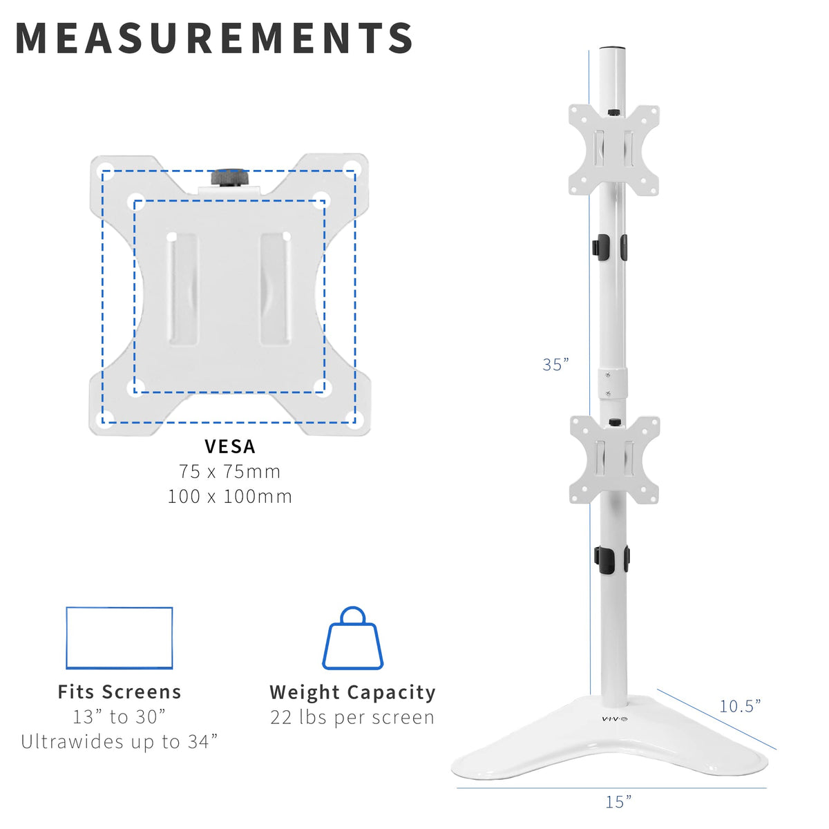 VIVO White Dual monitor vertical stand model STAND-V002LW. Every joint is able to be tightened, so you can adjust exactly how fluid/stationary you want everything. We've made mounting your regular and ultrawide monitors up to 34' easy with detachable VESA plates that screw into your monitor and then slide back onto the frame of the stand. Your monitors are supported by a 10.5' x 15' base designed to provide optimal stability while taking the least amount of desk space. Mount uses VESA 75x75 & 100x100 mounting holes. Key Measurements: From the desk to the top of the center post is 35' and the center post is 1.4' thick. Feature: - Tilt: 45 degree - Swivel: 360 degree - Rotate: 360 degree - Height adjustable - Integrated cable management system - Monitor can be installed either in portrait or landscape mode.