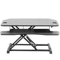 Enhance your workstation by finding the healthy balance between sitting and standing with DESK-V000KL from VIVO! Designed to make your work experience more comfortable and ergonomic, you can transform your current desk space by adding this corner dual tier height adjustable workstation to your existing office desk. Featuring a durable pneumatic spring that provides smooth transition, a height lock mechanism for perfect positioning, a large upper deck for dual monitor setups, and a preset hole for grommet installation options, this product was built to perform! All hardware is included for minimal assembly. Simply attach the keyboard tray with the included screws, and your desk is ready to go. Say goodbye to long days of sitting at the office, and end your work day feeling energized and refreshed!