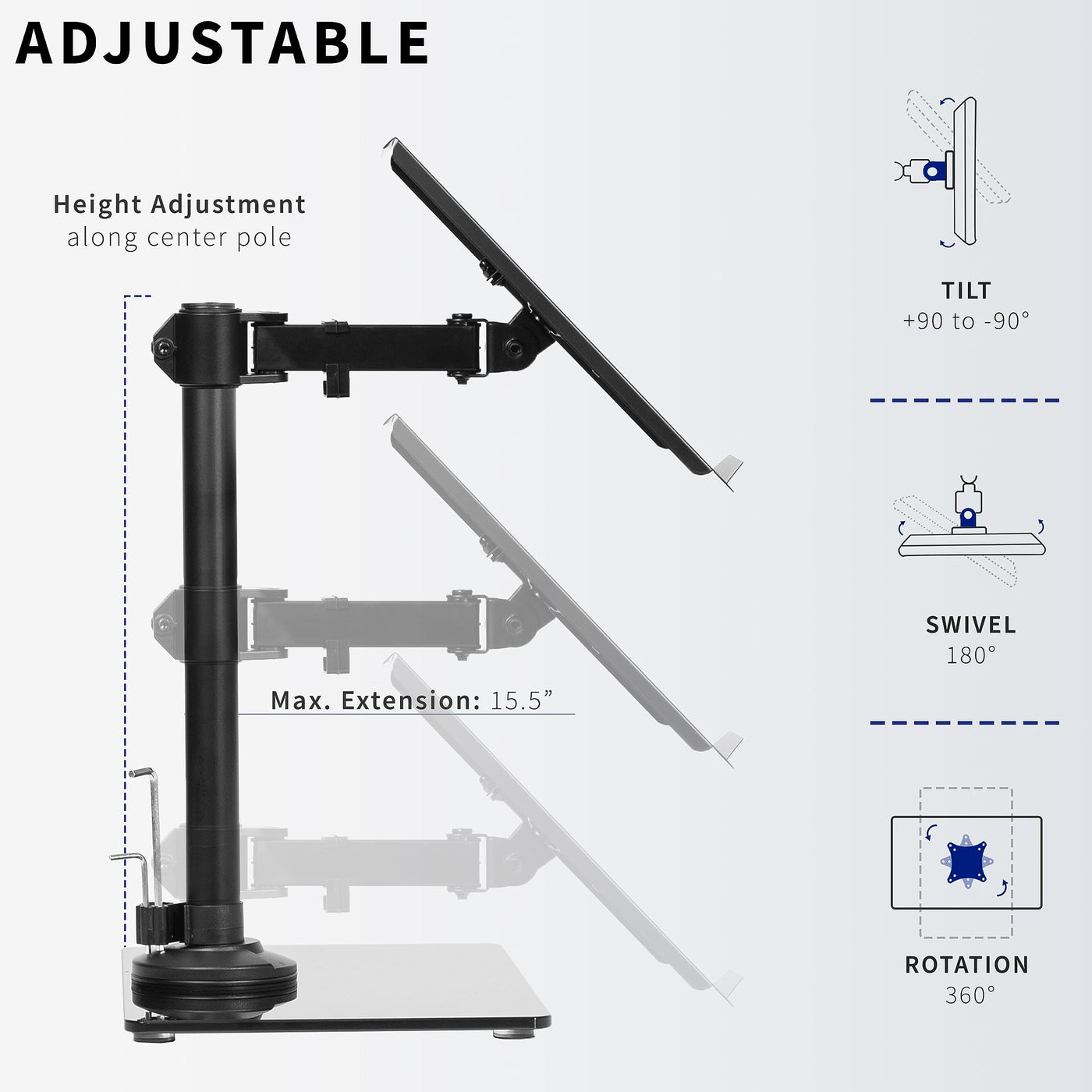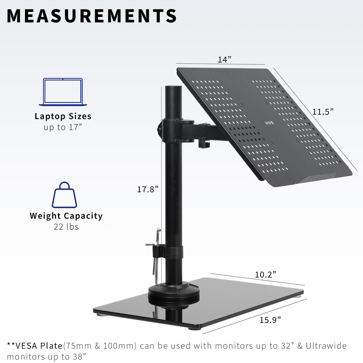 Elevate your work to a more ergonomic position and save valuable desk space with the Laptop Desk Stand (STAND-V001FGL) from VIVO! No need to install anything to your table with this sturdy mount. The sleek, glass base and high-grade steel design hold your laptop safe and secure without the need for drilling or clamping. Featuring tilt, swivel, rotation, and height adjustment along the center pole, you can find optimal viewing angles that increase work comfort. The ventilated tray holds laptops up to 17� to accommodate most brands on the market.