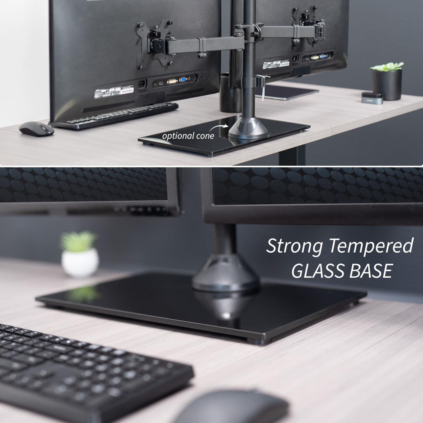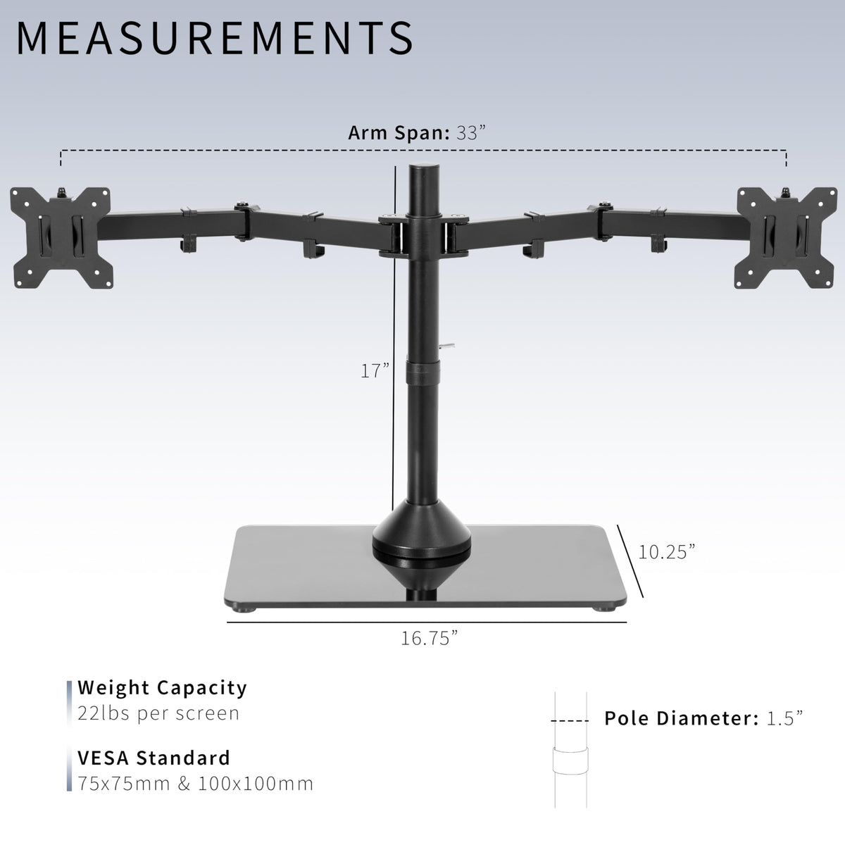 Compatibility - Fits 13' to 32' computer monitors weighing up to 10 kg each with 75x75mm or 100x100mm backside mounting holes. --Patented-- | Strong & Balanced Tempered Glass Base - Provides extra support and increases stability for dual screen setups. The rectangular base measures 42.5 cm x 26 cm and features bottom side padding. The pole and arms are made of steel. | Flexible Screen Positioning - Adjustable arms offer +90� to -90� tilt, 360� swivel, 360� rotation, and height adjustment along the center pole. Monitors can be placed in portrait or landscape positions. WARNING: Please do not pull monitors too far forward or backward unless the stand is bolted down, as this will cause stability issues. | Removable VESA Plates - Create a simple screen mounting process. We include easy-to-follow instructions and hardware for quick assembly. | We've Got You Covered - Sturdy steel design is backed with a 3 Year Manufacturer Warranty and friendly tech support to help with any questions or concerns.