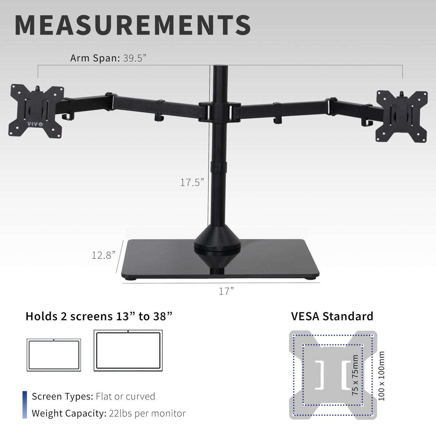 VIVO Freestanding Dual Ultrawide Monitor Stand with Sleek Glass Base and Adjustable Arms, 2 Screens up to 38 inches and 22 lbs Each, Black, STAND V038FG