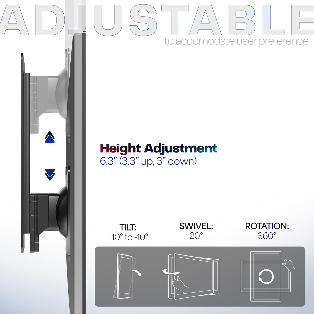 Fits 17� to 32� Screens- Single monitor wall mount fitting 17� to 32� screens weighing up to 8.0kg with VESA 75x75mm or 100x100mm hole patterns. Mounts to wood studs or drywall and creates a clean, ergonomic display. Please Note: Hardware for monitors with curved or recessed backs is not included. | Simple Height Adjustment - Change your monitor's height in an instant with the sliding mechanism. To raise the monitor, move it up until the latch engages at the desired height. To lower again, raise it all the way up, and then slowly slide it down to the desired position. | Smooth Articulation - Enjoy ergonomic viewing angles that increase comfort and reduce glares with +10� to -10� tilt, 20� swivel, 360� rotation, and 16.0cm of height adjustment (8.4cm up and 7.6cm down from center). Your monitor can be placed in portrait or landscape orientation. | Low Profile - Sits only 5.1cm from the wall for a space-saving, low profile setup. This keeps your monitor out of harm's way and increases the distance between you and your screen. | We've Got You Covered - Sturdy steel design is backed with a 3 Year Manufacturer Warranty and friendly tech support to help with any questions or concerns.
