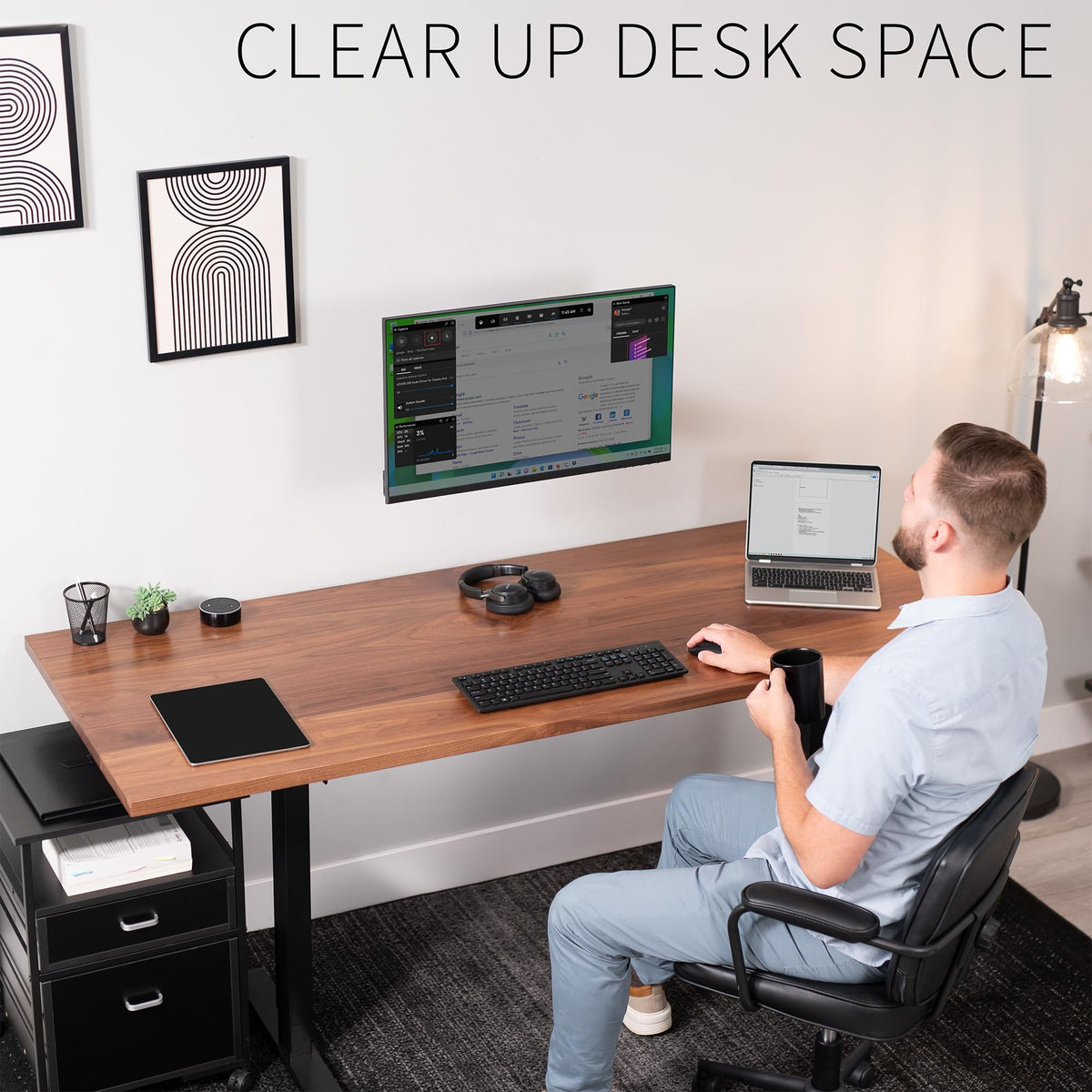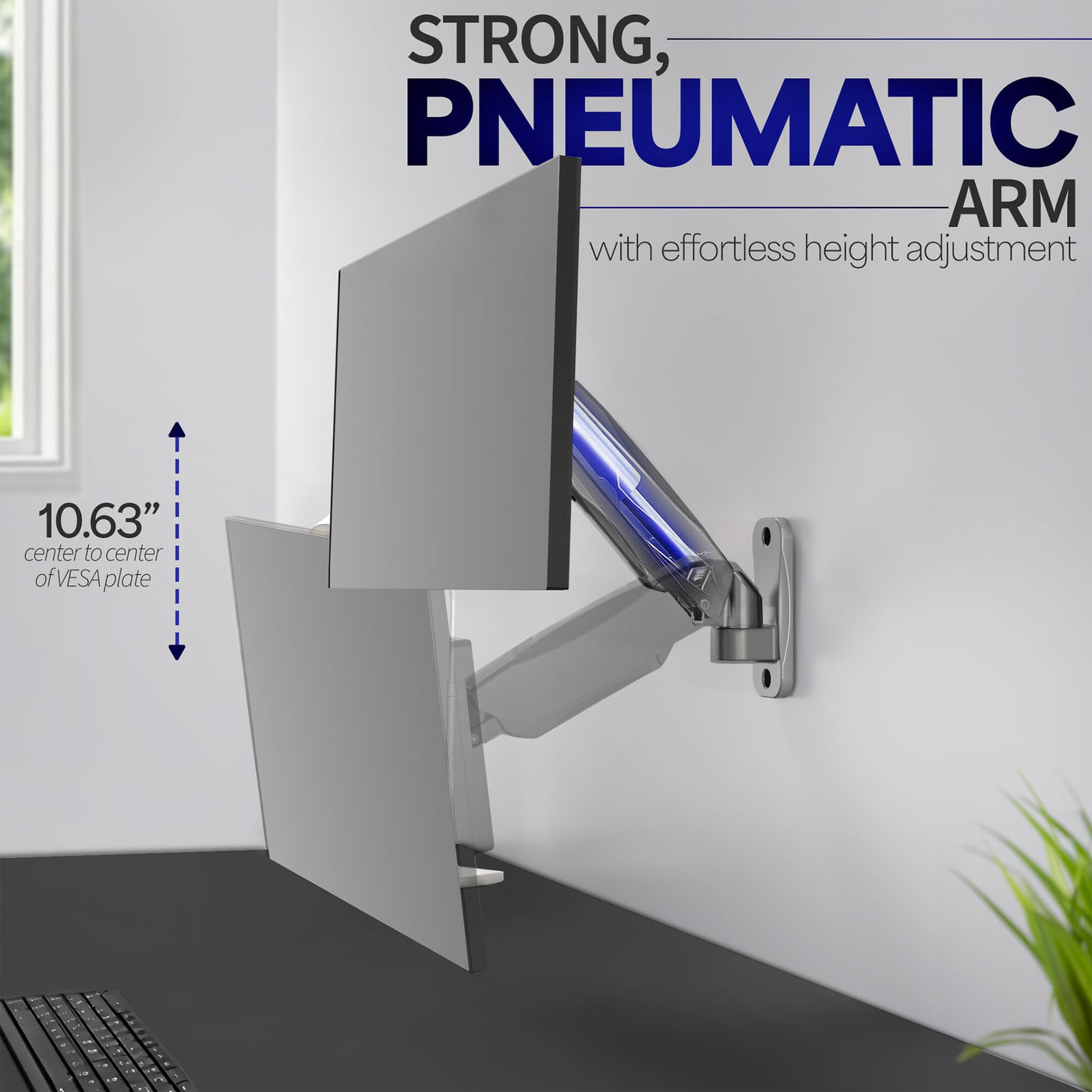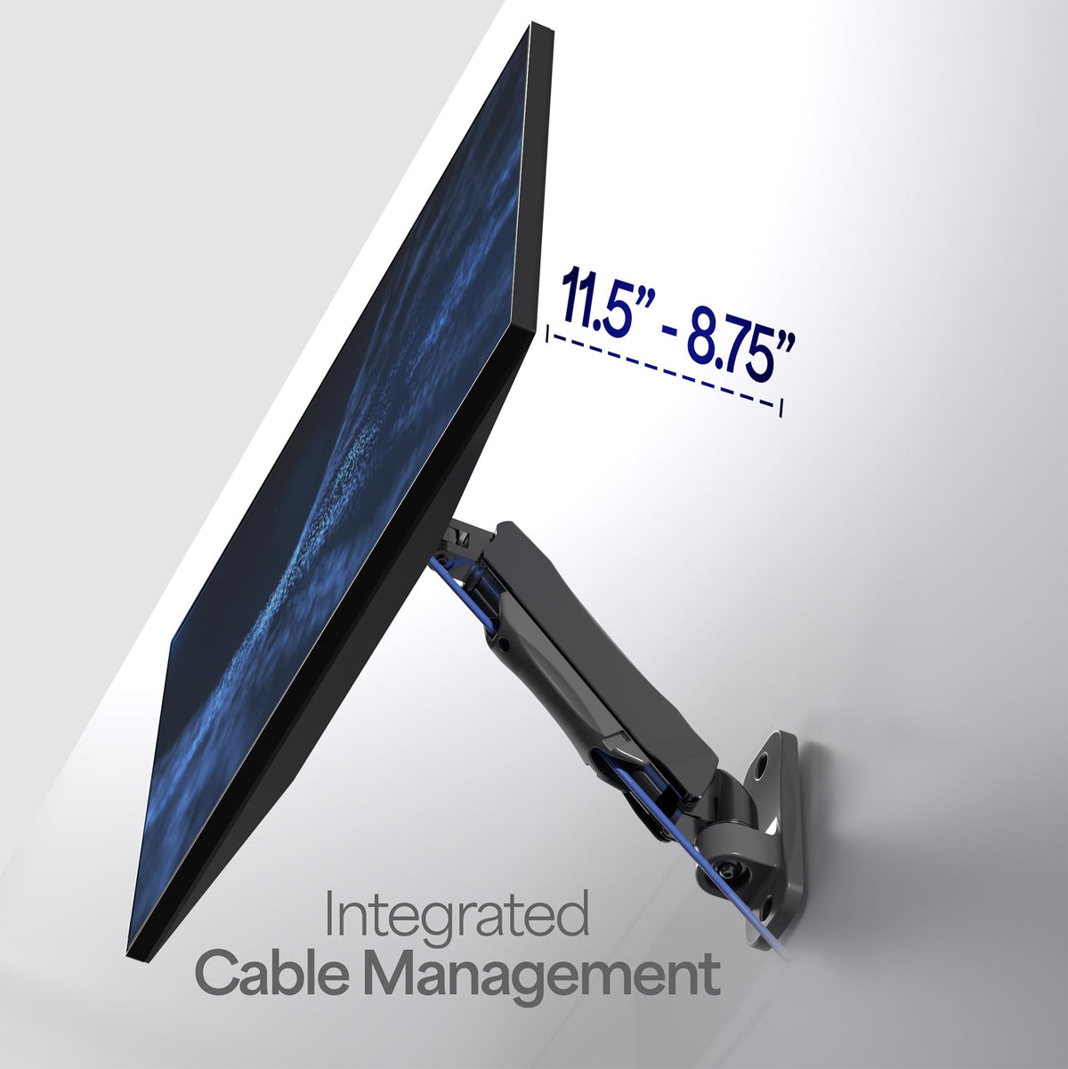 MOUNT-V001A is a brand new single monitor gas spring wall mount from VIVO. The gas spring arm allows for simple height adjustment without the use of tools and is fully adjustable for setting the monitor to almost any viewing angle. Comes with hardware for an easy mounting process including mounting screws, anchors, washers, and VESA screws. AV and power cords are kept organized by the integrated cable management. MOUNT-V001A is compatible with standard VESA 75x75mm and 100x100mm and fits screens up to 32' in size and 19.8 lbs in weight. Monitor can be placed in landscape or portrait position. The articulating arm reaches a max 14.75' from the wall.