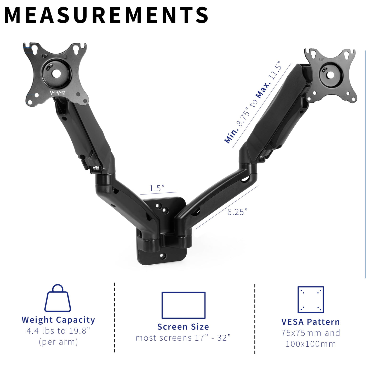 Clear up valuable desk space with the Pneumatic Arm Dual Monitor Wall Mount (MOUNT-V002G) from VIVO! The pneumatic spring extended arm allows for simple height adjustment without the use of tools and is fully adjustable for setting your monitors to almost any viewing angle. Comes with hardware for an easy mounting process including mounting screws, anchors, washers, and VESA screws. Your AV and power cords are kept organized by the integrated cable management system, and both monitors can be placed in landscape or portrait positions. The articulating arms reach a max of 20.5' from the wall.