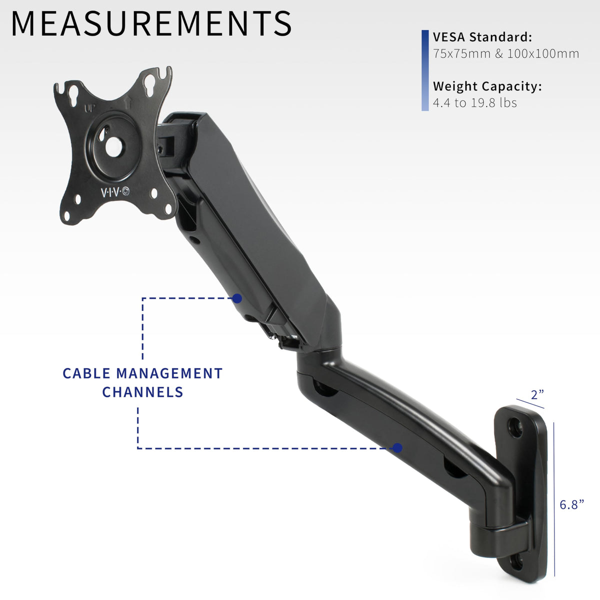 Clear Up Valuable Desk Space With This Single Monitor Pneumatic Spring Wall Mount (Mount-V001G) From Vivo! The Pneumatic Spring Extended Arm Allows For Simple Height Adjustment Without The Use Of Tools And Features Articulation For Setting The Monitor To Almost Any Viewing Angle. Comes With Hardware For An Easy Mounting Process (Including Mounting Screws, Anchors, Washers, And Vesa Screws). Av And Power Cords Are Kept Organized By The Integrated Cable Management, And Your Monitor Can Be Placed In Landscape Or Portrait Position. The Articulating Arm Reaches A Max Of 20.5'' From The Wall.