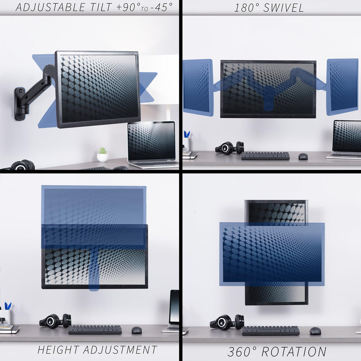 Vivo Height Adjustable Pneumatic Extended Arm Single Monitor Wall Mount, Full Motion Articulating, Fits 17 To 27 Inch Screen, Bl