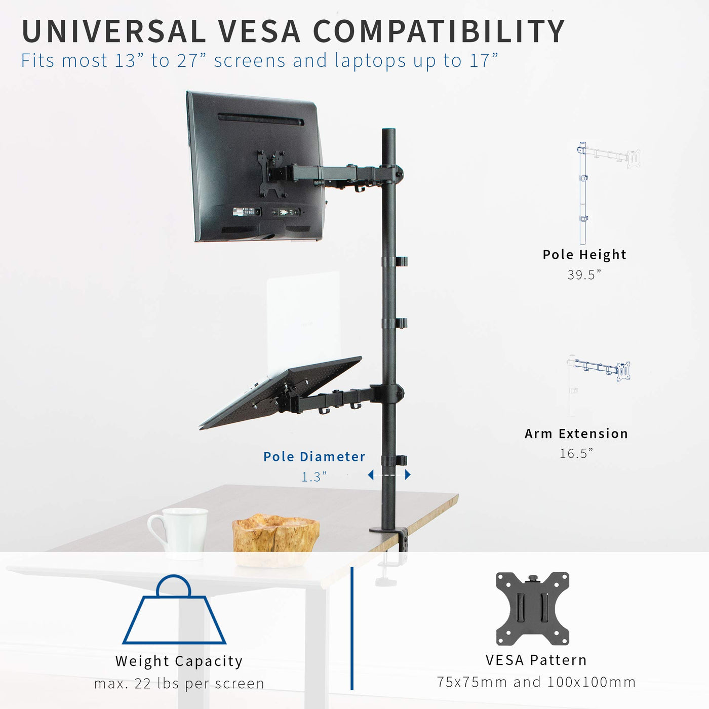 Increase productivity and save desk space with Dual Monitor Extra Tall Desk Mount with Laptop Holder (STAND-V012L) from VIVO! Designed for 13� to 27� screens with VESA 75x75mm and 100x100mm hole patterns, this versatile desk mount fits the majority of monitors on the market. The ventilated laptop tray holds laptops and notebooks up to 17� in size. Elevate your work to a more comfortable and ergonomic position so you can enjoy ending the day without soreness. With this stand's extra tall pole for more height options, articulating arms for flexible screen positioning, and 2 + 1 screen layout for triple the viewing capability, this product is ready to change your work experience! High-grade steel construction along with the heavy-duty C-clamp and optional grommet ensure your monitors and laptop will be kept secure.