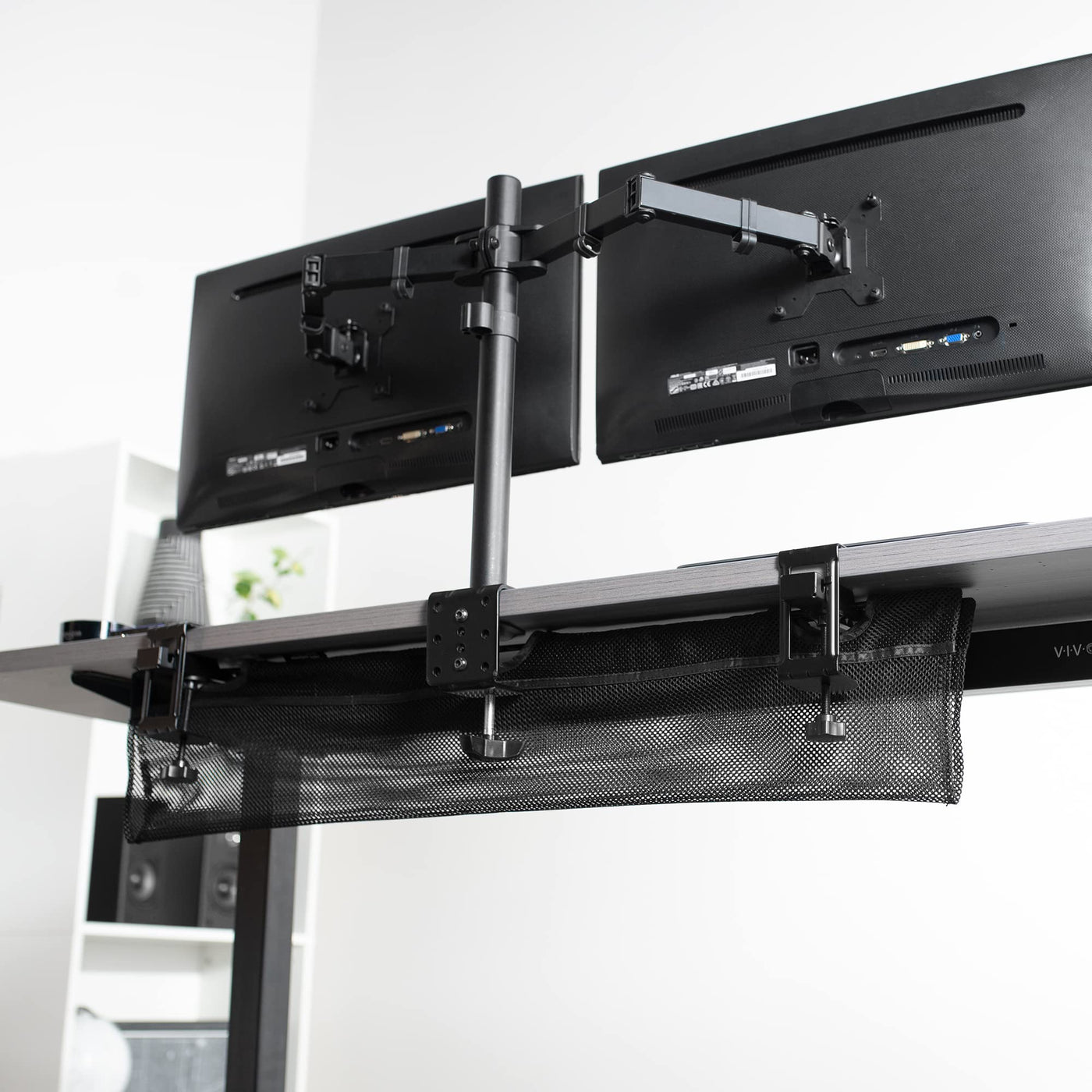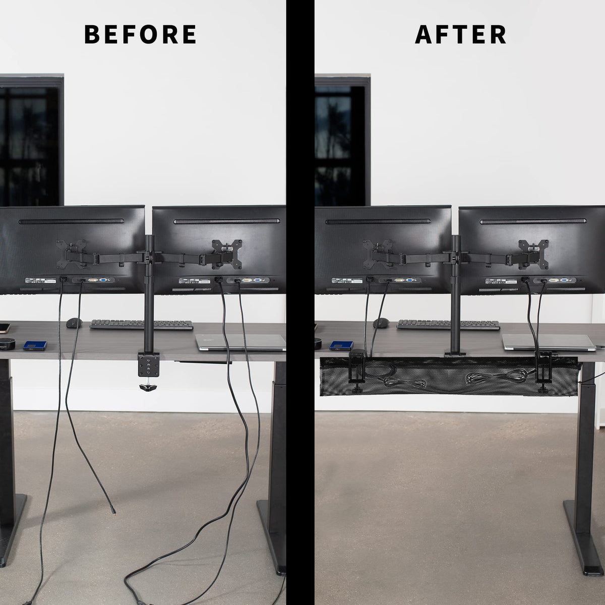 Clamp-On Mesh Cable Management: Easily route cables under the desk with simple installation for a better system. C-clamps secure to the desktop with no drilling required. Compatible with surfaces 0.6� to 2.8� thick with 8.5� of clearance under the desk | 36� Mesh Netting: Low profile black mesh material loops over the clamps to create an under-desk net perfect for power strips, cables, power bricks, and more. The netting holds up to 11 lbs and can be adjusted to a narrow or wide fit along the brackets | Flame Resistant Material: The lightweight mesh allows increased airflow and is constructed of flame-resistant material for added safety | Clutter-Free Setup: Give yourself an office space that encourages concentration with all of your ethernet wires, power cables, USB hubs, and more safely under your desk. The netting hangs just 5.5� to 7� below the desk surface for a low profile solution | 3-Step Installation: Enjoy hassle-free assembly and installation in 3 easy steps! Simply attach the connectors to the support bars, feed the support bars through mesh panel holes, and secure the C-clamp to your desk surface