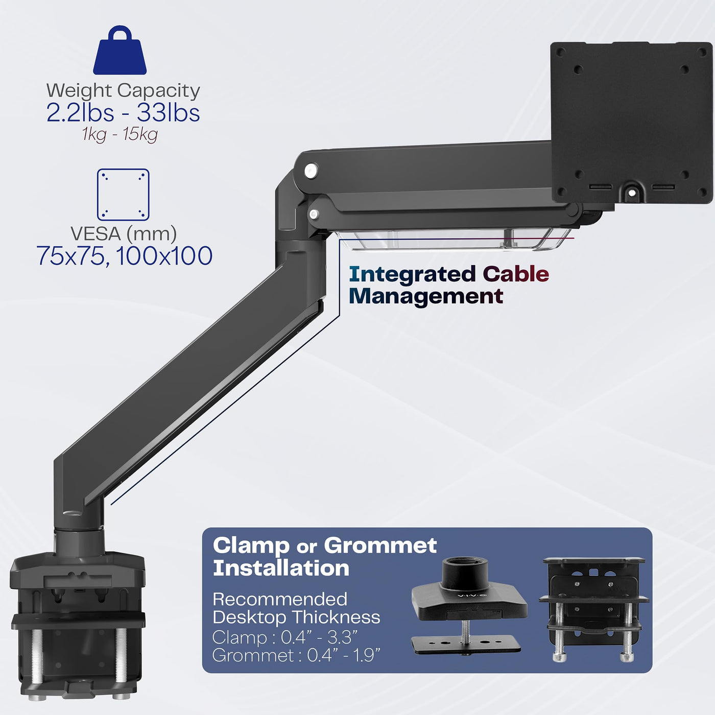 Reclaim your desk space and enjoy comfortable viewing angles with Premium Single Monitor Arm (STAND-V101G1) from VIVO! Elevate your ultrawide monitor to an ergonomic height and adjust the viewing angle with just the touch of a hand. Featuring high-quality aluminum construction, flexible joints, smooth height adjustment, a sturdy desk clamp and grommet mount, integrated cable management, and more, this stand is ready to transform your workspace. The versatility of screen placement encourages comfortable viewing that aids in decreased muscle strain on the neck, back, and shoulders. The classy appearance adds a modern look to any office while providing excellent support for your ultrawide monitor (up to 49'). All hardware and instructions are provided for easy assembly, so you can get your stand secured and monitor mounted in no time!