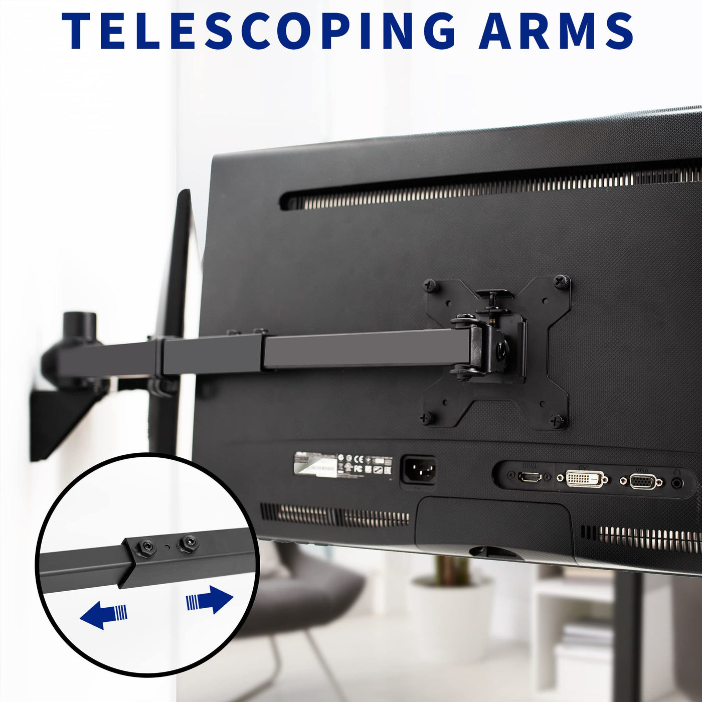 Fits 27� to 38� Monitors - Dual monitor mount fitting two ultrawide and regular screens up to 38� in size and 22 lbs in weight (each) with VESA 75x75mm or 100x100mm mounting holes. Installing your monitors is a simple process with detachable VESA brackets, and we provide hardware for wood stud installation. --Patent Pending-- | Premium Telescoping Arms for Flush Wall Setup - Heavy duty arms adjust in length to fit larger, ultra-wide monitors. Unique telescoping design expands arms straight outwards, creating a clean, flush-to-wall setup. The arms slide into each other for added strength and stability. | Articulation & Height Adjustment - Adjustable mount offers +90� to -90� tilt, 180� swivel, and 360� rotation for comfortable viewing angles. Monitors can be placed in portrait or landscape orientation. | Save Desk Space - Protect your equipment and clear room on your desktop by getting your screens conveniently mounted to the wall at an ideal height. Cable clips are provided to route cords for an organized appearance. | We've Got You Covered - Sturdy steel design is backed with a 3 Year Manufacturer Warranty and friendly tech support to help with any questions or concerns.