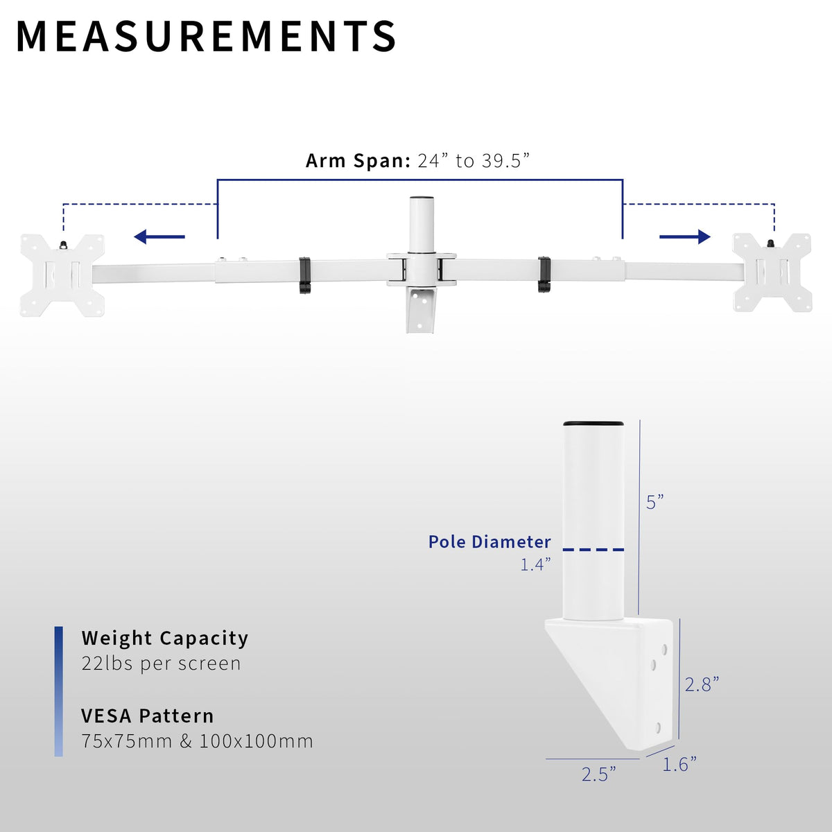 Fits 27� to 38� Monitors - Dual monitor mount fitting two ultrawide and regular screens up to 38� in size and 22 lbs in weight (each) with VESA 75x75mm or 100x100mm mounting holes. Installing your monitors is a simple process with detachable VESA brackets, and we provide hardware for wood stud installation. --Patent Pending-- | Premium Telescoping Arms for Flush Wall Setup - Heavy duty arms adjust in length to fit larger, ultra-wide monitors. Unique telescoping design expands arms straight outwards, creating a clean, flush-to-wall setup. The arms slide into each other for added strength and stability. | Articulation & Height Adjustment - Adjustable mount offers +90� to -90� tilt, 180� swivel, and 360� rotation for comfortable viewing angles. Monitors can be placed in portrait or landscape orientation. | Save Desk Space - Protect your equipment and clear room on your desktop by getting your screens conveniently mounted to the wall at an ideal height. Cable clips are provided to route cords for an organized appearance. | We've Got You Covered - Sturdy steel design is backed with a 3 Year Manufacturer Warranty and friendly tech support to help with any questions or concerns.