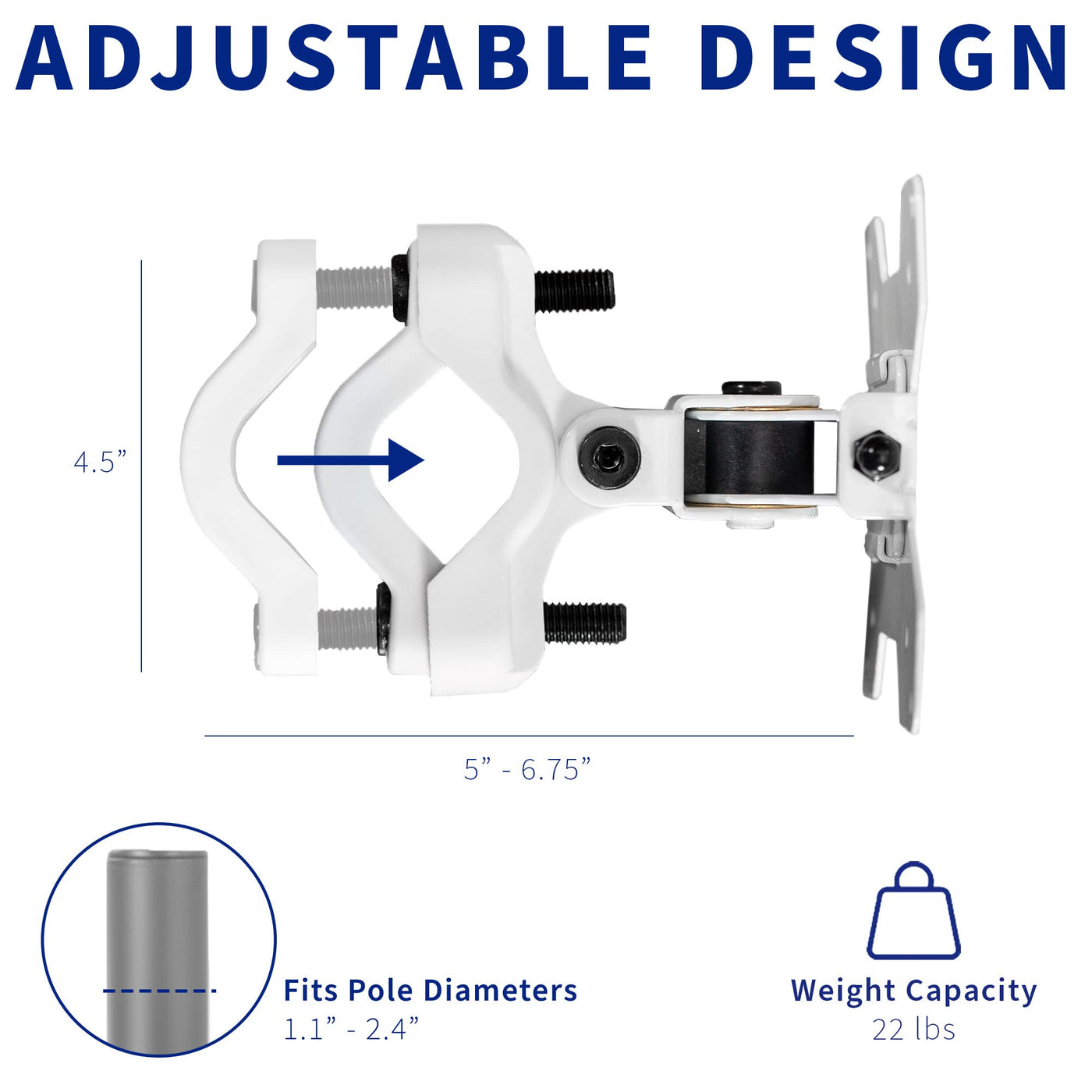 Mounting your Monitor or TV screen just got easier with White Universal Pole Mount Bracket (MOUNT-POLE01W) from VIVO! Whether you want to update your current monitor stand�s VESA compatibility or add mounting capability to an existing pole, this sturdy bracket has you covered. It holds one 13� to 30� screen weighing up to 22 lbs with VESA 75x75mm and 100x100mm mounting hole patterns. Fitting pole diameters from 1.1� to 2.4�, this durable bracket gives you placement options for the ideal screen location. And that�s not all! Once your screen is mounted, the bracket is adjustable with -30� to +30� tilt, 160� swivel, and 360� rotation for comfortable viewing angles that relieve tension on the neck, back, and shoulders. We provide all the necessary hardware for assembly, and a removable VESA plate makes mounting and unmounting your screen a fast and easy process.