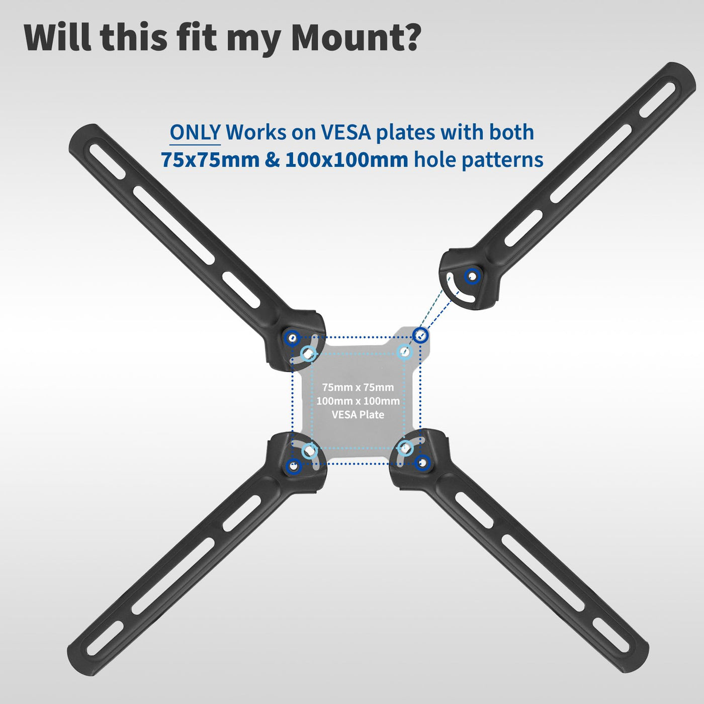 If You Have A Tv With 400X400Mm Mounting Holes And Can'T Find A Vesa Compatible Mount, We Have A Solution! With Mount-Ad4X4 From Vivo, A Standard 75X75Mm Or 100X100Mm Vesa Mount Will Now Fit Screens With Vesa Patterns Up To 400X400Mm! Solid Steel Construction Makes These Brackets Designed For Security, Durability, And Scratch Resistance. The Black Color Blends Well With Nearly Any Setup To Maintain A Low Profile Appearance And Contribute To The Elegant Look Of Your Screen Setup. Installation Is A Fast And Easy Process With The Universal Hardware Pack And All The Necessary Instructions To Help You Get Your Screen Mounted In No Time! Compatibility Vesa Compatible: Used With Vesa 75X75Mm And 100X100Mm Lcd Mounts, Allowing Them To Fit Vesa 400X400Mm Mounting Hole Patterns Weight Capacity: 99 Lbs (Do Not Exceed) Specifications Color: Black Material: Steel Surface Finish: Powder Coating Length Of Bracket: 10.5