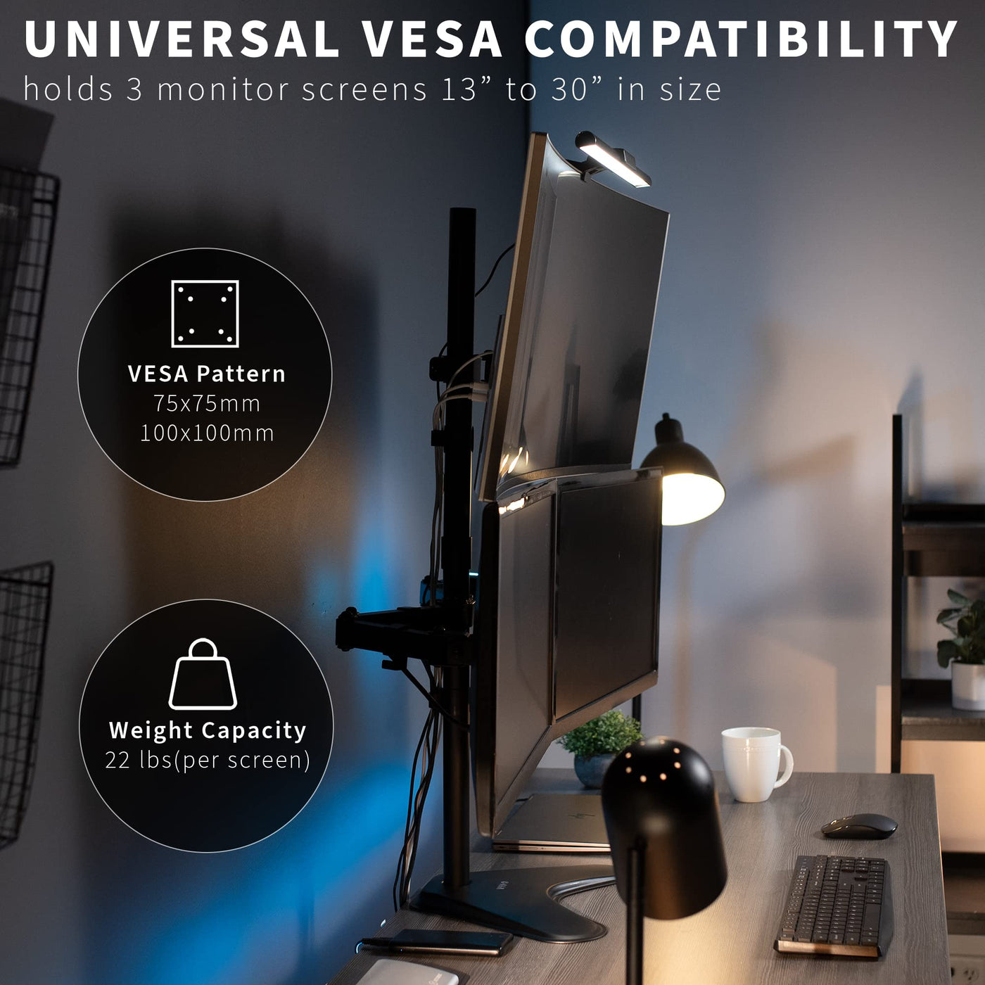 Compatibility Supports three screens up to 27' in size Each arm holds up to 22 lbs in weight Works with VESA pattern mounts (75 X 75 and 100 X 100 mounting holes)