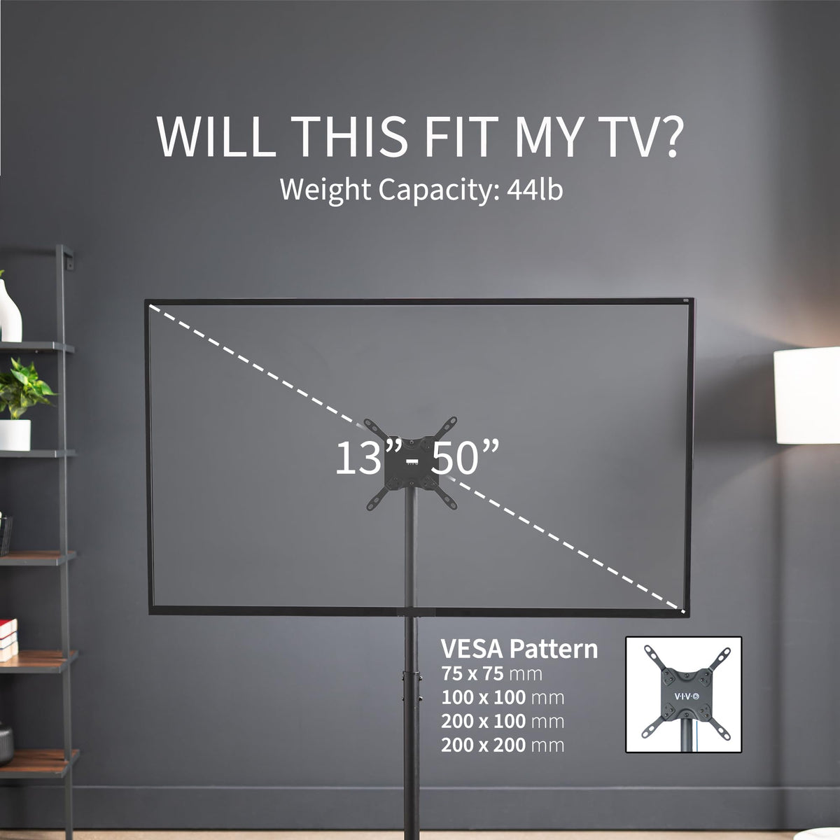Fits 13' To 50' TV's - Compatible with most 13' to 50' LCD LED flat screens weighing up to 44 lbs with VESA patterns 75x75mm, 100x100mm, 200x100mm, or 200x200mm | Height Adjustment and Tilt - This simple and attractive TV stand features 12 set points of telescopic pin lock height adjustment and 0� to +30� screen tilt for optimal viewing angles. Maximum screen height from floor to center of screen is 49 | Stable Base - The solid steel base measures 20� x 18� and comes with adjustable feet to level the entire stand on uneven floors | Easy Installation - We provide the necessary hardware and instructions to get your stand assembled and TV mounted | We've Got You Covered - Sturdy steel design is backed with a 3 Year Manufacturer Warranty and friendly tech support to help with any questions or concerns