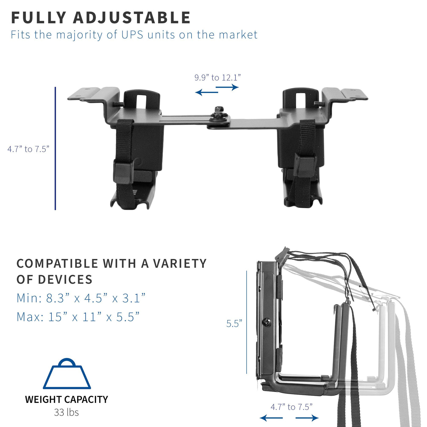Enhance Your Workspace By Mounting Your Uninterruptible Power Supply Unit With The Universal Under Desk And Wall Ups Mount (Mount-Ups01) From Vivo! In Addition To Supporting The Majority Of Ups Units And Mini Itx & Sff Pc Cases On The Market, This Versatile Mount Also Fits The New Playstation 5! Compatible Device Sizes Range From 8.3 X 4.5 X 3.1 (Minimum) To 15 X 11 X 5.5 (Maximum), So This Product Gives You Options! Sturdy Steel Construction Ensures Your Device Is Safe And Secure In Its New Location, And Mounting Hardware Is Provided For Both Wall And Under Desk Installation. An Open-Frame Design Allows Sufficient Airflow To Keep Your Ups Or Mini Pc Well Ventilated During The Long Work Day. All The Necessary Hardware And Instructions Are Provided, So You Get Your Ups Easily Mounted In A Safe, Out Of The Way Location. Compatibility: Universal: Fits The Majority Of Ups Units On The Market Additional Compatibility: Fits The Playstation 5 And Most Mini Itx And Sff Computers Mounting Options: Wood Stud Wall, Concrete/Brick Wall, Drywall, Under Desk Minimum Compatible Ups Or Pc Size: 8.3 X 4.5 X 3.1 Maximum Compatible Ups Or Pc Size: 15 X 11 X 5.5 Minimum Desk Thickness: 0.6 (16Mm) Weight Capacity: 33 Lbs Specifications: Color: Black Material: Steel Bracket Dimensions: (9.9 To 12.1 )L X 5.5 W X (4.7 To 7.5 )H