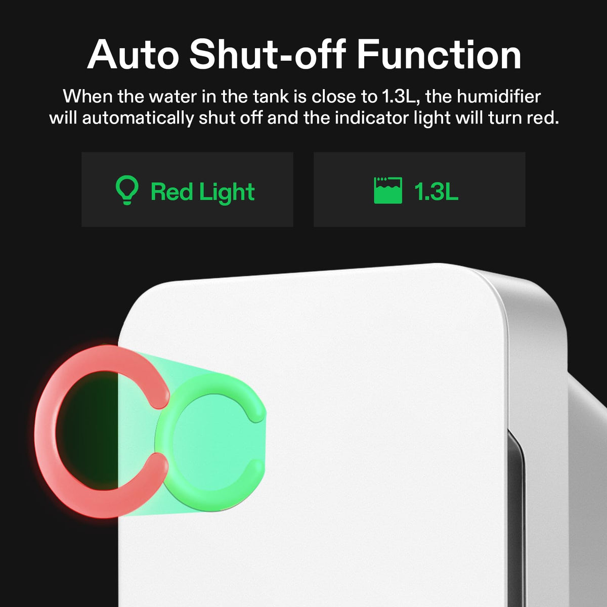 Q: How does the auto shut-off function work?A: The auto shut-off function activates when approximately 1.3L of water is collected in the tank, turning on a 'Red' LED indicator light to alert you that it's time to empty the tank.