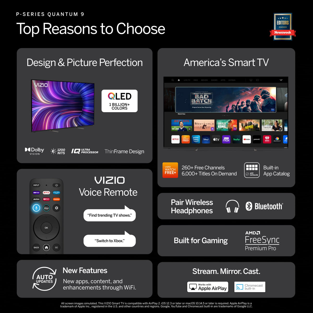 Feel The Power Of The Extraordinary New P-Series 4K Hdr Smart Tv The P-Series Is Our Most Colorful Tv With The Spectacular Quantum Color Engine Generating Up To 115% More Color In Every Pixel Than Standard 4K Hdr Tvs Ultrabright 1200 And Active Full Array Intelligently Calibrate Screen Brightness And Darkness For Intensely Vibrant Hues, Strikingly Deep Blacks And Mesmerizing Contrast Dolby Vision High Dynamic Range (Hdr) Combined With A Full Array Backlight Delivers Stunning Picture Quality, Transporting You Into The Story Through Richer Contrast, Brighter Highlights, And Eye-Popping Color The Lightning-Fast Vizio Iq Ultra Processor Delivers Enhanced Picture Processing And A Faster Entertainment Browsing Experience, While The Progaming Engine With Auto Game Mode, Variable Refresh Rate With Amd Freesync Premium Pro, 4K 120Fps, Hdr Gaming With Dolby Vision And Hgig, Ultra-Low Input Lag, And Newly-Added Gaming Menu Take Console Gaming To A Whole New Level Enjoy The Award-Winning Smartcast Platform Loaded With The Best Selection Of Built-In Apps, An All-New Voice Remote, Bluetooth Headphone Capability, And Apple Airplay 2 And Chromecast Built-In From Its Superior Picture Performance To Refined Finish And Premium Design, The New P-Series Projects Powerful Beauty In Every Way And Represents The Pinnacle Of 4K Smart Tv Entertainment