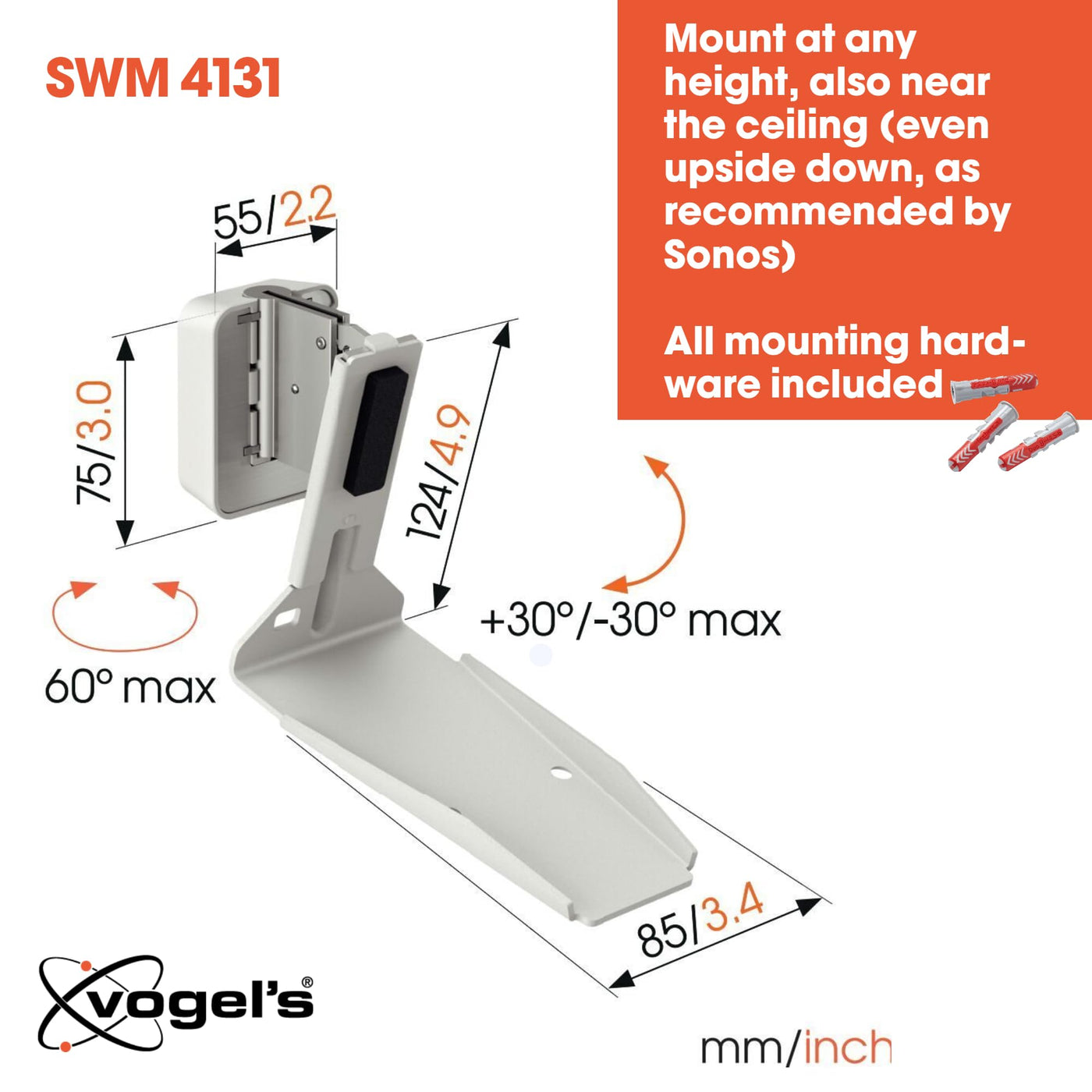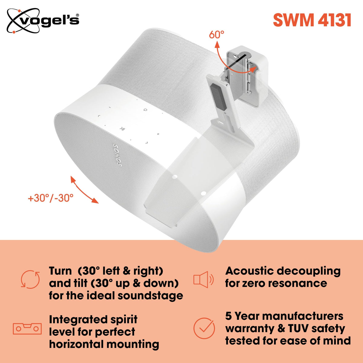 Vogel'S Swm 4131 Speaker Wall Bracket For Sonos Era 300, Max. 11 Lbs (5 Kg), Tiltable 30/+30, Swivels Up To 60 (Left/Right), Wh