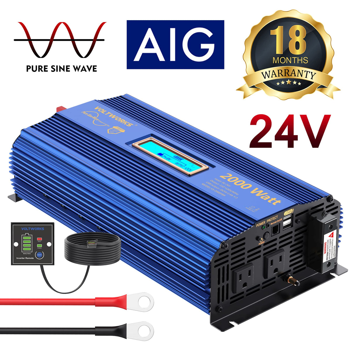 Voltworks 24 Volt 2000W Pure Sine Wave Power Inverter Dc 24V To Ac 110V 120V And Hardwire Block With Lcd Display Remote Controller And Battery Cables Dual 2.4A Usb For Charging Rv Van Truck Boat