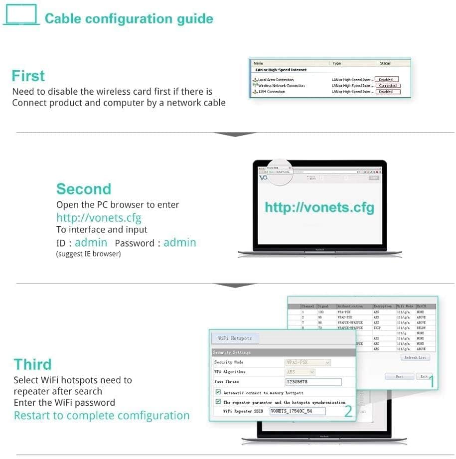Video User Guide:Https:Wwwyoutubecomwatchv=Qq86Ozbwrme&Feature=Youtubevap11G-300 Is An Environmentally And Safe Wifi Signal Repeater Working In The Repeater Mode, Vap11G-300 Can Be Doubled To Extend The Original Wifi Signal Coverage, While It Can Ensure The Security Of The Wireless Signal, Its Working Principle Is: At The Edges Of The Original Wifi Hot Spot Signal Coverage, The Vap11G-300 That In Repeater Mode Is Able To Receive Weak Wifi Signal, And Then Zoom In To The Normal, Safe Strength, And After Optimization, Error Correction Processing, To Achieve Signal Coverage Distance Doubled Extension Under Safe This Differs From Traditional Wireless Signal Amplifier - Only Amplifies The Signal And Ignore The Wireless Security Features: 1Wifi Intelligent Bridge Function, Wireless Switch Wired, Wired Switch Wireless, Intelligent Switch 2Wifi Intelligent Repeater Mode, It Supports Wifi Hot Spots Scan Automatically And Wifi Hot Spot Memory Function 3Support Turn Off The Wifi Hotspot Function 4Support Web Remote Firmware Upgrade, Can Get The Latest Firmware Free Hardware Specifications: Interface:1 Dc20 Power Hole 1 Dedicated Two In One Power Supply Cable, With A Set Of Power Supply And A Set Of 10100M Adaptive Ethernet Cable Button:Reset Button (Long Press 5 Seconds) Antenna: Built-In 2Pcs Smart Omnidirectional 2Dbm Antennas Basic Function: Wifi Hot Spot Scan Automatically Wifi Hot Spot Memory Wifi Hot Spot Switches Input Voltage: Dc5V-15V Total Input Power: =5W Packages: 1*Vap11G-300 1*English User Manual 1*Retail Boxwarranty:30 Days Money Back And 12 Months Guarantee Has Any Set Up Questions, Just Feel Free To Contact Us: Support@Vonetscom
