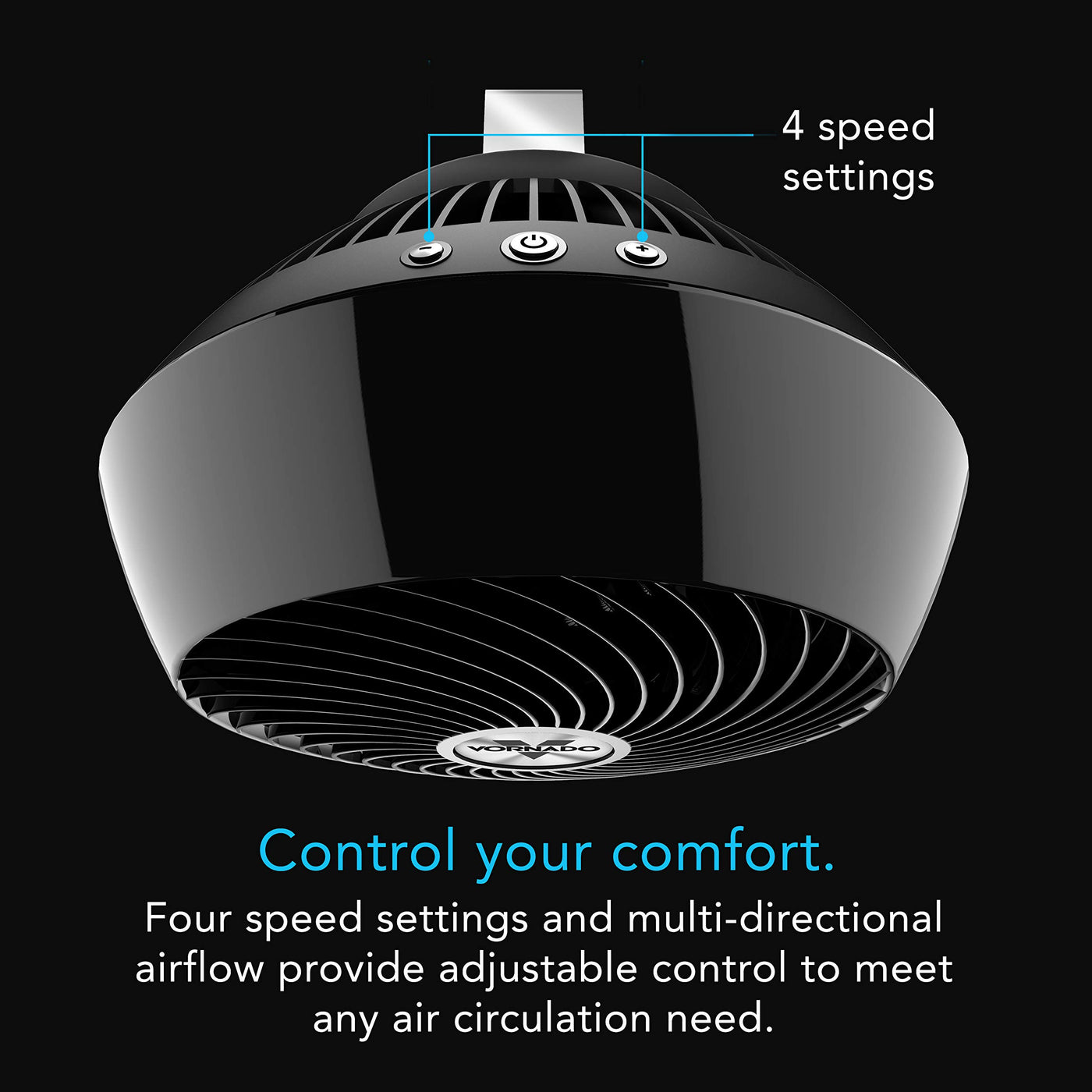Q: What features does the Vornado 560 Fan offer for user comfort?A: The Vornado 560 Fan includes a 4-speed control for customizable airflow, allowing you to adjust the fan speed according to your comfort level. It also features a multi-directional airflow system with a chrome glide bar to direct air where you need it most.