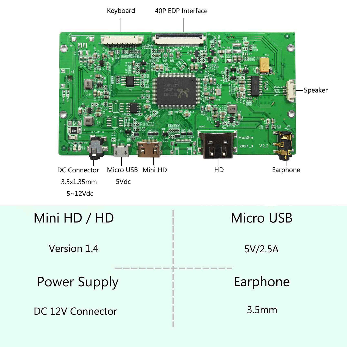 Lcd Controller Board:&Nbsp;Hd-Mi Lcd Board Work For 9.7Inch Edp Interface Lcd Screeninput Power Supply: Dc Connector 3.5Mmx1.35Mm 5~12Vdc Mirco Usb 5Vdc.(Please Note The Lcd Display Can Only Be Powered With The Dc Connector,Which Can Not Be Powered With The Micro Usb Port.)Come In Standby Model When Not Input Signalstandby Model ≪1Wvideo Input: Mini Hd-Mi Hd-Mi Version 1.4 Mini Hd-Miaudio Output: Earphone Support Speaker 4Ohm 2W Or 8Ohm 1.5Wosd: Brightness Contrast Auto Language And So Onlanguage: English French German Spanish Italian And So Onboard Size: 120Mm X 62.5Mm X 5Mm9.7'' 2048X1536 Lcd Screen:Display Mode Ips, Normally Black, Transmissiveresolution 2048Rgb) 1536Outline Size 208.88 167.12 5 (H V D)Display Area 196.608 147.456 (H V)Brightness 440 Cd/M (Typ.)Contrast Ratio 600:1 (Typ.) (Tm)&Nbsp;Viewing Angle 89/89/89/89 (Typ.)(Cr=10) [Left / Right / Up / Down]Refresh Rate 60Hzsignal Interface 51 Pins Edp (4 Lanes) , Fpcbacklight Wledinput Voltage 3.3V (Typ.)Packing List :1 Hd-Mi Lcd Controller Board Vs-Rtd09703-V11 9.7Inch 2048X1536 Ips Lcd Screen(One Of Lp097Qx1 Ltl097Ql01 Hq097Qx1)1 Converter Board1 Signal Cable1 Keyboard With Cable