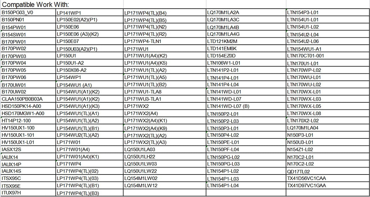 Q: What devices are compatible with the VSDISPLAY FIX 30PIN Double 2ch 6bit LVDS Cable?A: The VSDISPLAY FIX 30PIN cable is compatible with various LCD screens including models like B150PG03 V0, LP141WP1, LP171WP4, and many more, supporting 15 to 19-inch LVDS screens.