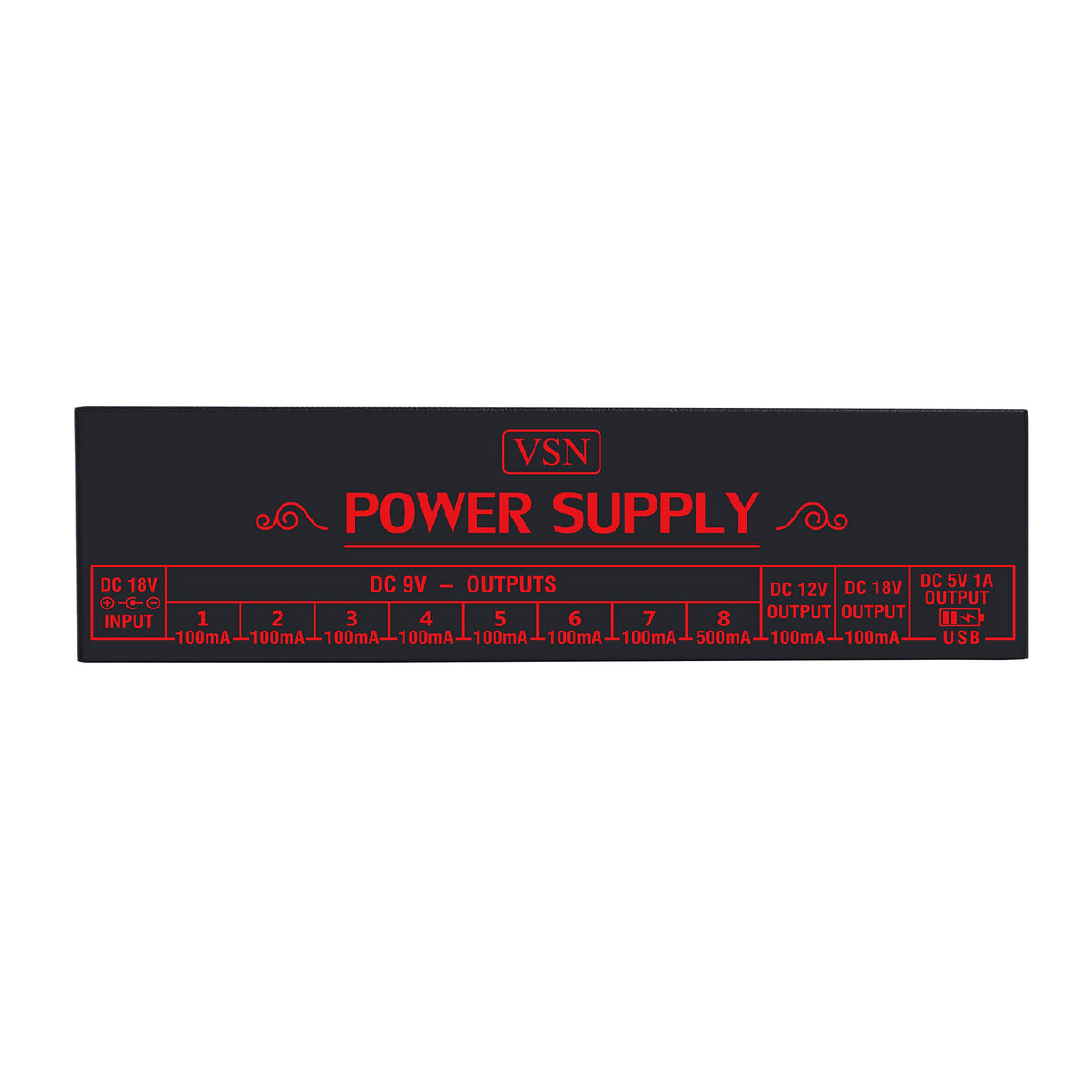 Instructions For Vsn Pw-01 Guitar Pedal Power Supply 10 Isolated Dc Output For 9V/12V/18V Guitar Bass Effectpedals With Usb Charging Port For Guitar Pedals Power: Ac 100V - 240V 50/60Hz Power For: 9V,12V,18V, 5V 1A Usb Input: Dc 18V Output: 7 Way 9V 100Ma Material: Aluminum Alloy Please Ensurethe Power Input Is Dc 18V 1A. Plug Standard With Negative Internal And Positiveexternal. Promise:&Nbsp; 12 Months Unconditionally Solution&Nbsp; Package Spec: Product Size: 17.2 X 4.5 X 3.3Cm Package Size: 23.8 X 5.8 X 10Cm Package Weight: 620G Package Included: 1 X Pw-01 Power Supply 1 X Power Adapter 8 X 55Cm Cables 2 X20 Polarity Conversion Cables 1 X User Manual; 1 X Polishing Cloth; Specifications For Output: 7 Way 9V 100Ma 1 Way 9V 500Ma 1 Way 12V 100Ma 1 Way18V 100Ma 1 Way5V 1A Usb Power Status Indicator Lights: When The Indicator Switch Is On,Indicator Lights Will Be On To Show Available Power Supply Sockets. Attention:&Nbsp;&Nbsp;Please Check The Polarity Of Power Adapter Before Using, Or It May Damage The Quipment.&Nbsp; Attention: 1. Thisproduct Is Not Waterproof. To Avoid Electric Shock, Please Keep Away From Waterand Do Not Use This Productin A Moist Or Any Other Potential Liquid Risk Environment. 2. Do Not Disassemble Or Attempt Short Circuit Or Usein A High Temperature Environment. 3. Do Not Putthis Product In A Place Where Children Can Easily Touch. 4. Please Use The Specified Adapter To Avoid Problems Caused By Different Specification. 5. Pleasestore The Product In A Dry Environment When Not In Use.