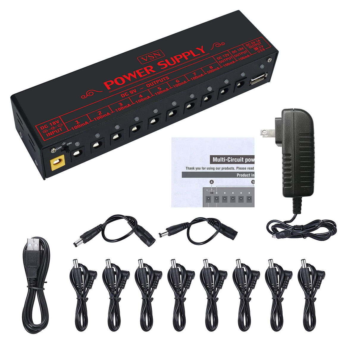 Vsn Guitar Pedal Power Supply 10 Isolated Dc Output For Power Supply 9V/12V/18V Dc Outputs & Usb Charging Port With Short Circui