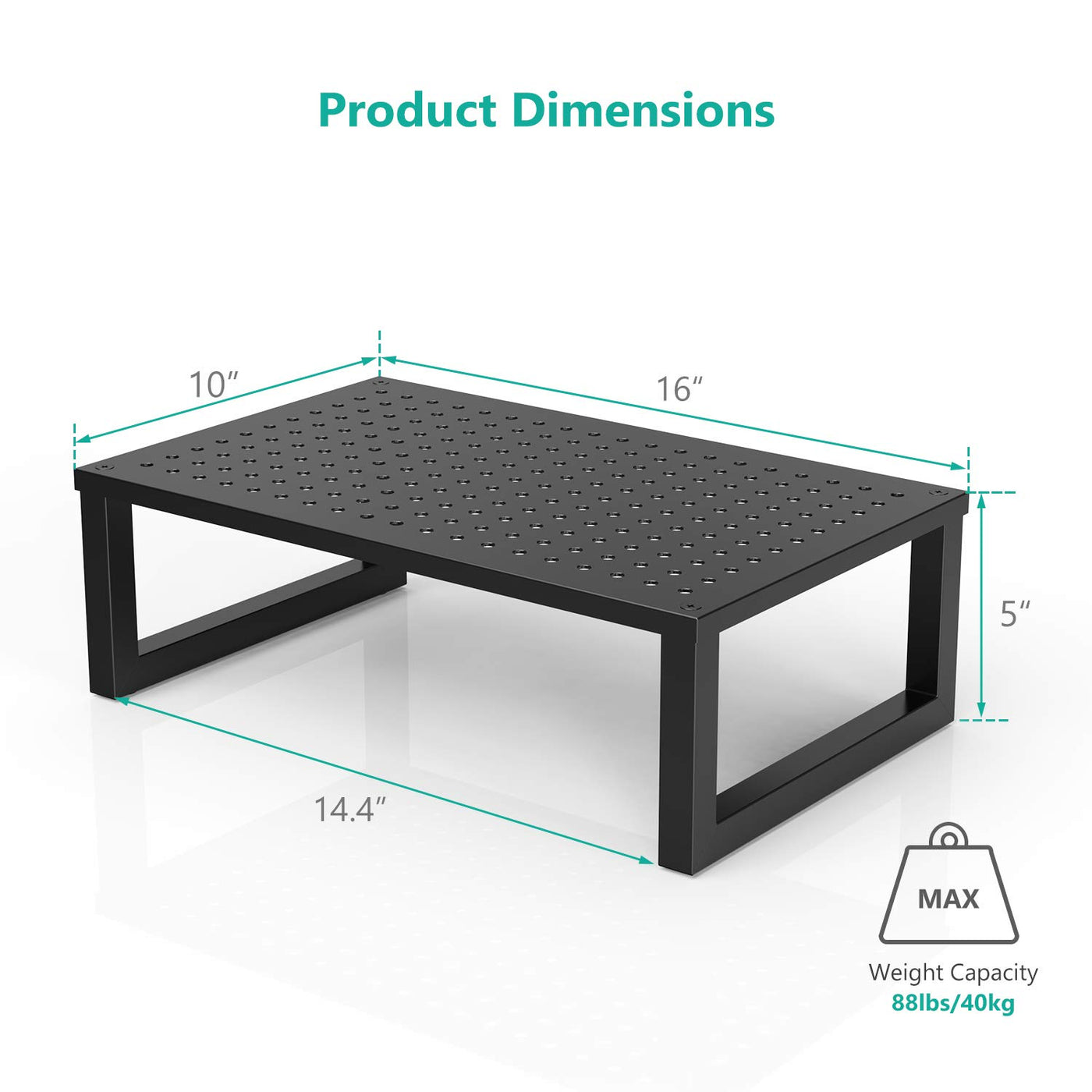 Specification: * Dimension: 16 x 10 x 5 inches (L x W x H) * Supports: maximum hold up to 88lbs/40kg What is the stand riser suitable for? * Computer, Monitor, Laptop, Printer, Notebook, most LED, LCD, OLED flat screen display Why do people need to choose a riser? What benefits can we get from WALI monitor stand riser? * WALI Monitor Stand Riser will raise the height of your monitor or laptop up by 5 inches. Raising the monitor to eye level which creates a comfortable viewing position and healthy posture. * Give more valuable desktop space. The 16 x 10 inches space underneath the sturdy platform can be used to store anything like paper, cable box, Gaming device, and keyboard. Keep your desk clean and tidy. * Ventilated platform prevents your device from overheating. Especially for the laptop user, keep your device run with cool and fresh air. Package Includes: * 1 x WALI Metal Vented Monitor Stand Riser * User Manual