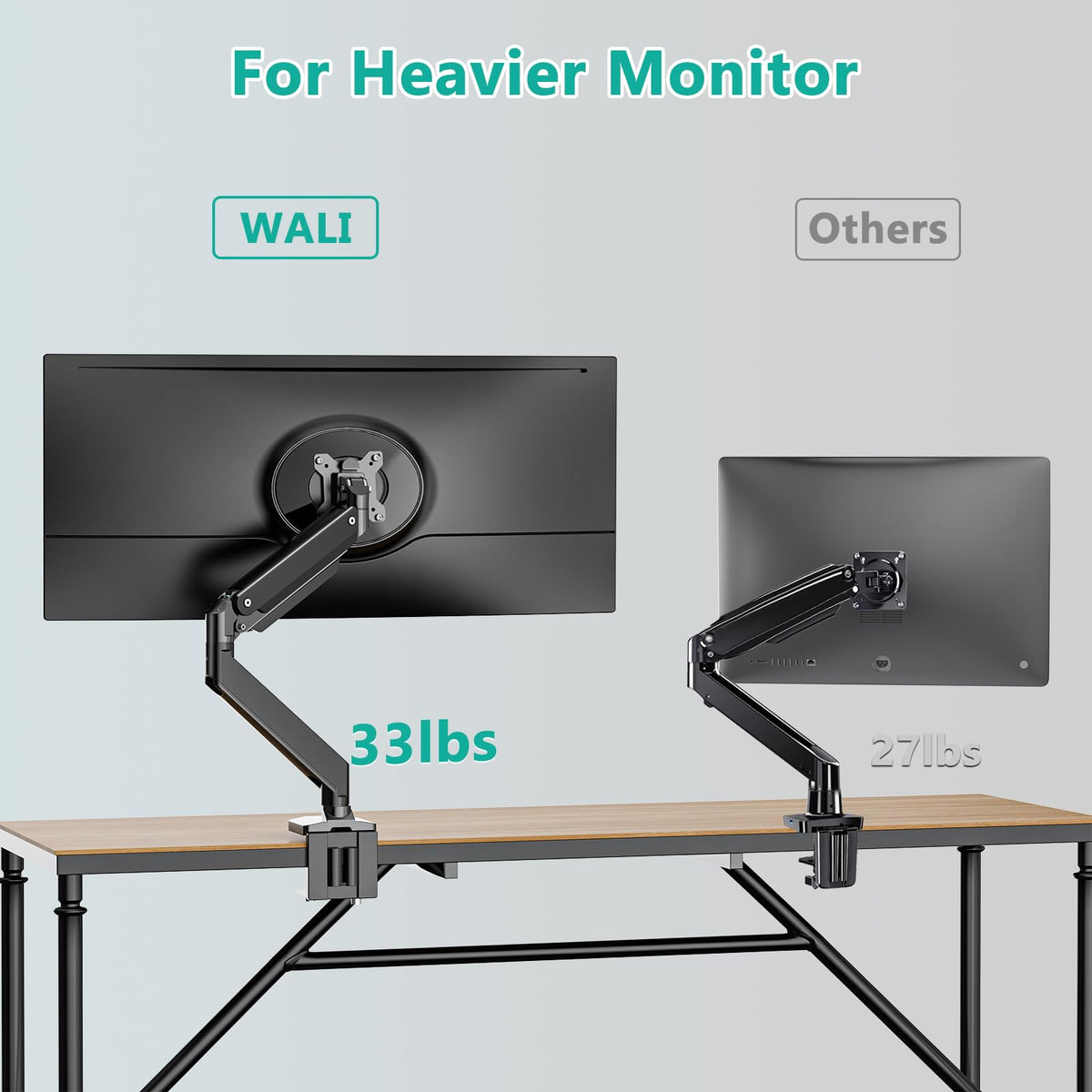 WALI Single Monitor Gas Spring Desk Mount, Heavy Duty Monitor Arm for Ultrawide Screen up to 35 inch, 33 lbs. Fully Adjustable, Mounting Holes 75 and 100 (GSM001XL), Black