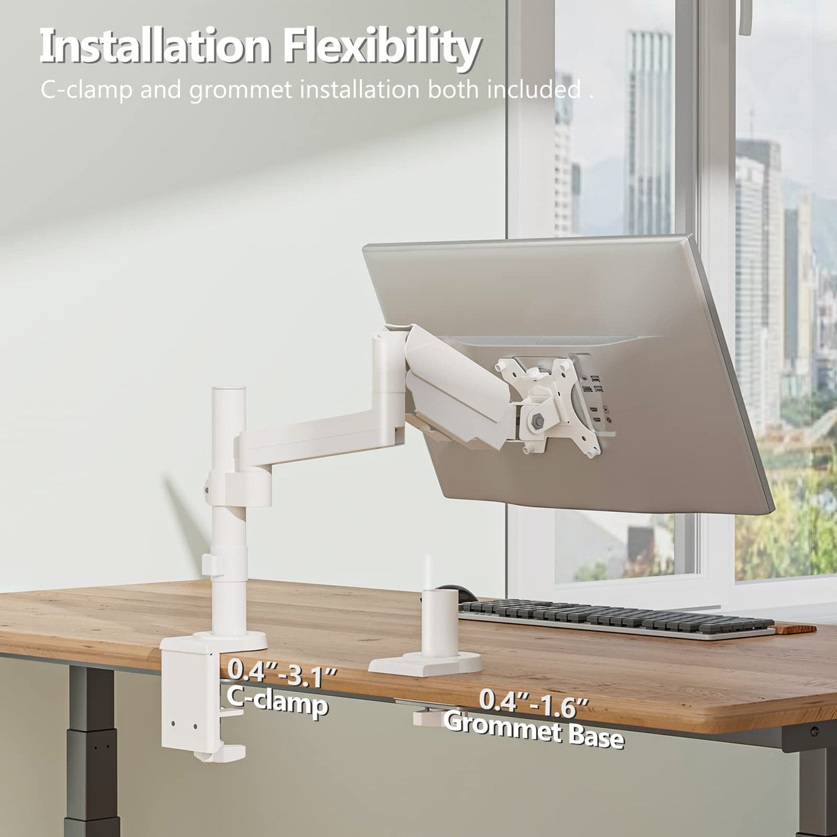 Application: The monitor desk mount fits LCD, LED flat screen TV and monitor up to 32 inch. Support up to 19.8lbs. Mounting Pattern Fits 75 x 75mm or 100 x 100 mm. The two-stage locking system applied to 3.1inch C-clamp and 1.6 inch Grommet Base. | Fully Adjustable: The gas spring stand can tilt +35�/-35�, swivel +90�/-90�, and rotate 360�. Max height is up to 23.62 inch, and max extension is up to 18.34 inch. | Double Benefits: Double efficiency and productivity to make working or relaxing that much more comfortable. | Sturdy Construction: High-grade material C-Clamp, grommet base, and Mounting Pattern ensures a strong and stable connection with your desk and monitor screen. | Package Includes: WALI Single Monitor Gas Spring Stand x 1, Mounting Hardware Kit, User Manual, experienced and friendly US based customer support available to assist 7 days a week.