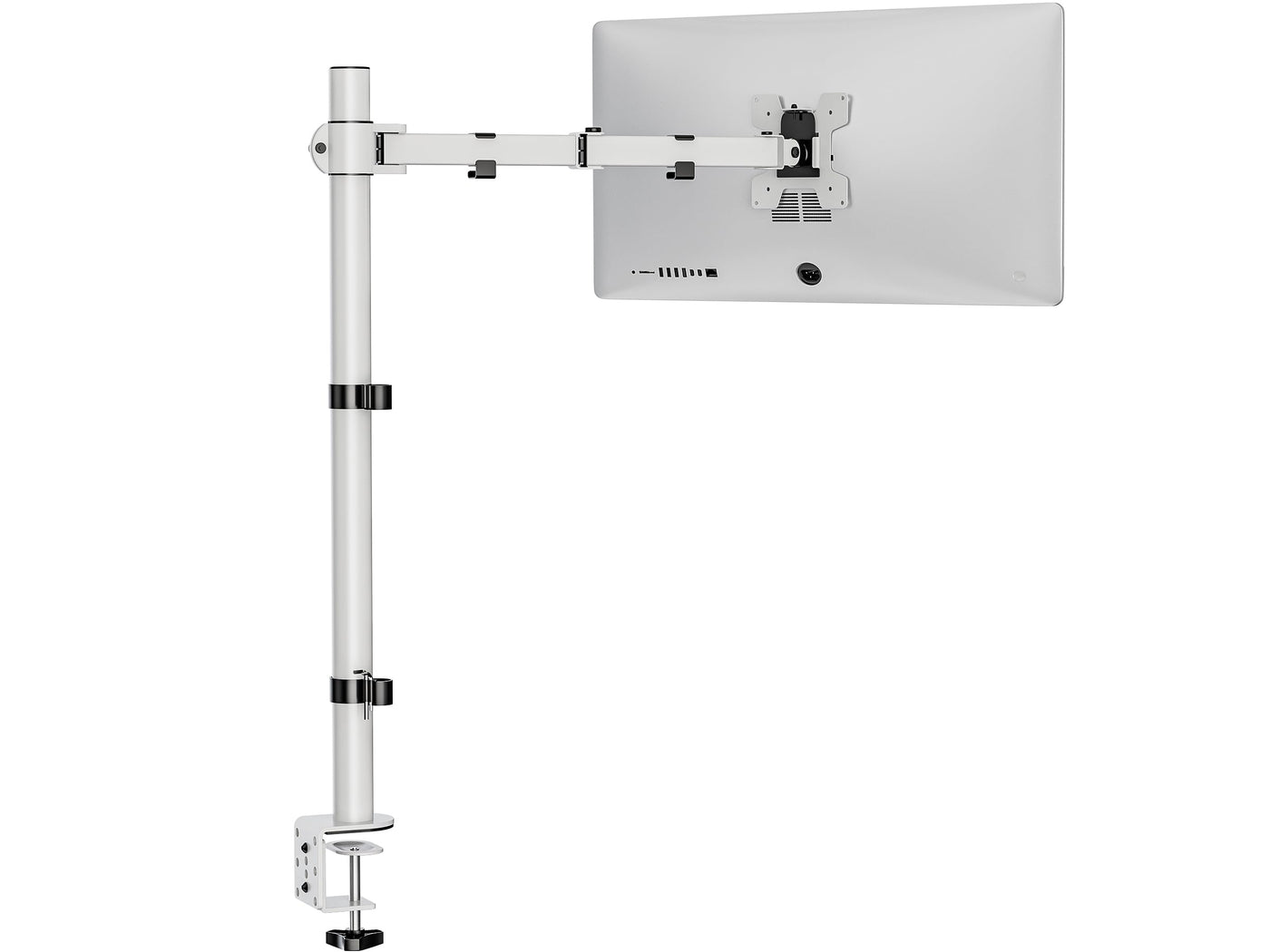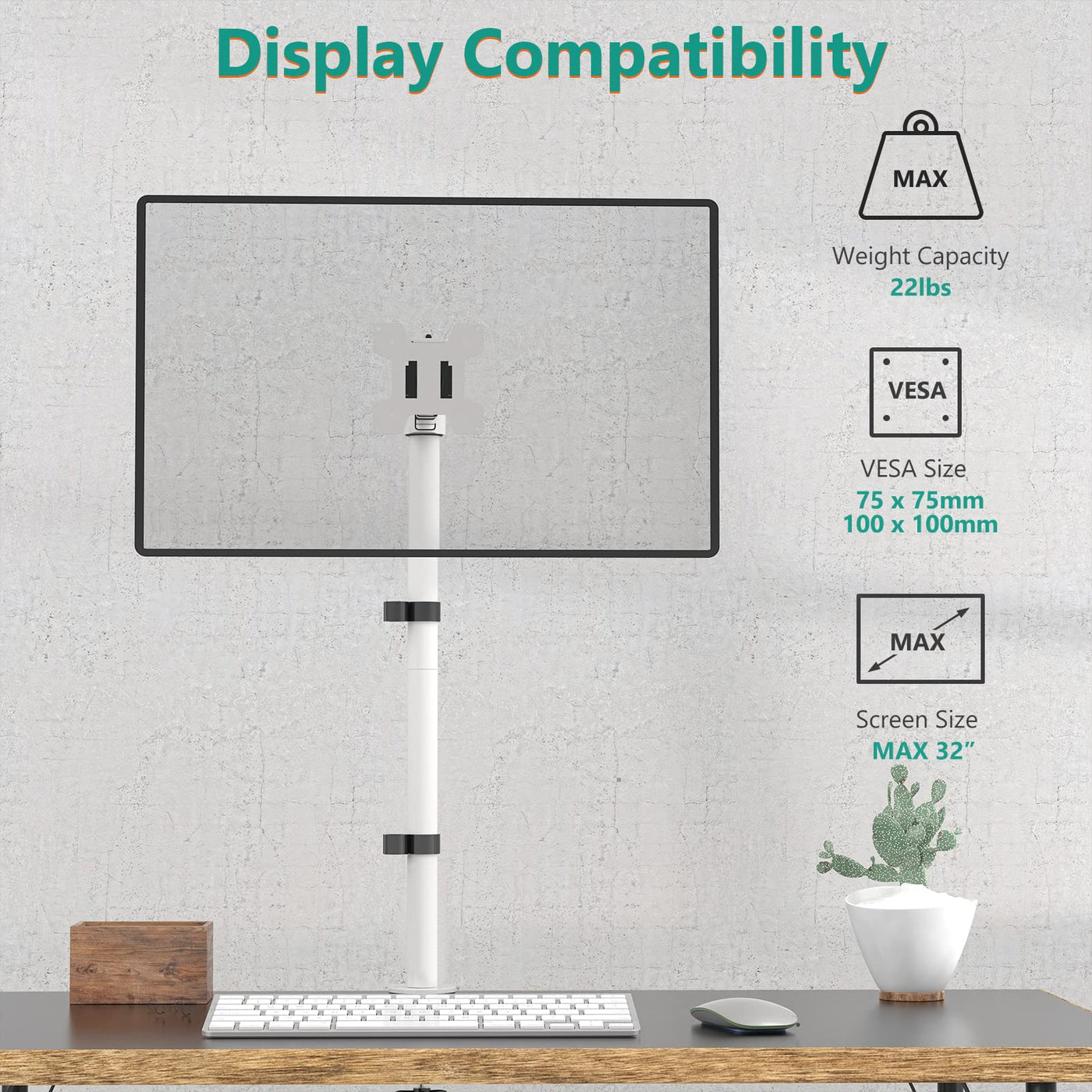 Application: Fits most flat panel monitor up to 32� and supports weight up to 22lbs. Mount plates detachable and height adjustable adapt to mounting holes 75x75mm and 100x100mm | Multiple Options: The two-stage locking system applied to 3.5� C-clamp and 3� Grommet Base | Multiple Adjustment: The high-grade arms extend and retract, +/-90� tilt and swivel to change reading angles, and 360� rotate from landscape to portrait mode | Extra Tall Pole: The 31.5� height pole provides you with more adjustment space for your monitor. Double efficiency and productivity by opening up desk space allow working in a more comfortable, ergonomically correct position to reduce neck and eye strain | Package Includes: 1 x WALI Extra Tall Single Monitor Mount (White), 1 x Mounting Hardware Kit, User Manual, experienced and friendly US based customer support available to assist 7 days a week