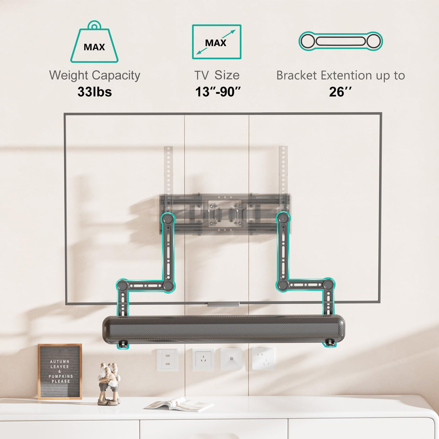 ?Universal Compatibility?Designed to fit sound bars from leading brands like Samsung, Sony, Vizio, Bose, LG, and Roku, this mount is compatible with most TV wall mounts (fixed, tilt, full motion, articulating) and TV mounting holes up to 800x400mm. | ?Flexible Positioning?Features adjustable angles for mounting your sound bar either above or below the TV. Anti-slip pads are included for sound bars without mounting holes, ensuring a secure fit. | ?Sturdy Construction?Made from high-quality black brushed steel, this mount can securely hold sound bars weighing up to 33 lbs (15 kg), ensuring stability even during intense sound effects. | ?Versatile Installation Options?Connects stylishly to TV wall brackets or directly to TVs on stands, allowing for corner installations without the need for wall mounting. Perfect for maximizing space and enhancing your viewing experience! | ?Comprehensive Package?Includes 2 x WALI Sound Bar Brackets, a complete mounting hardware kit, and a user manual. Enjoy dedicated customer support available 7 days a week to assist you with any questions.