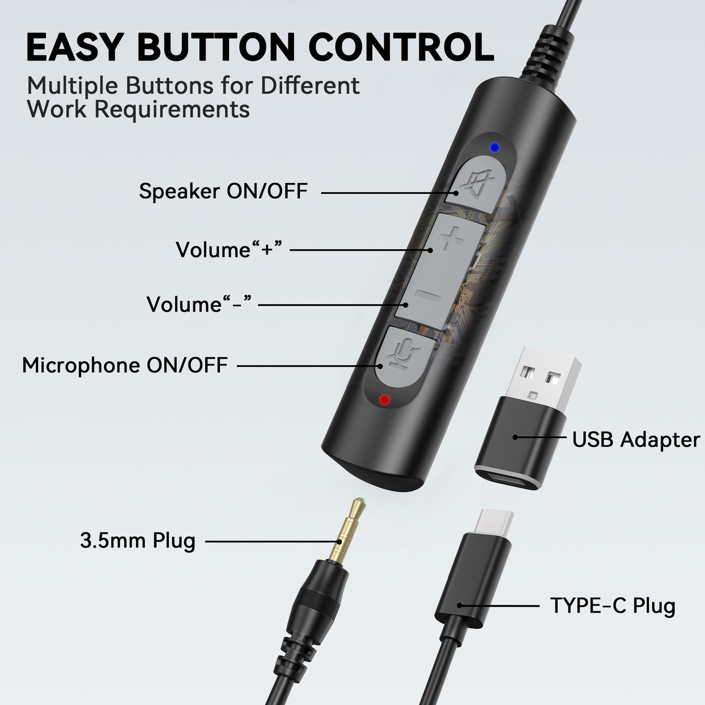 Wantek Headset With Microphone For Pc, Usb Wired Headphones - Usb-C Over-Ear 3.5Mm Headsets With Noise-Cancelling Microphone For