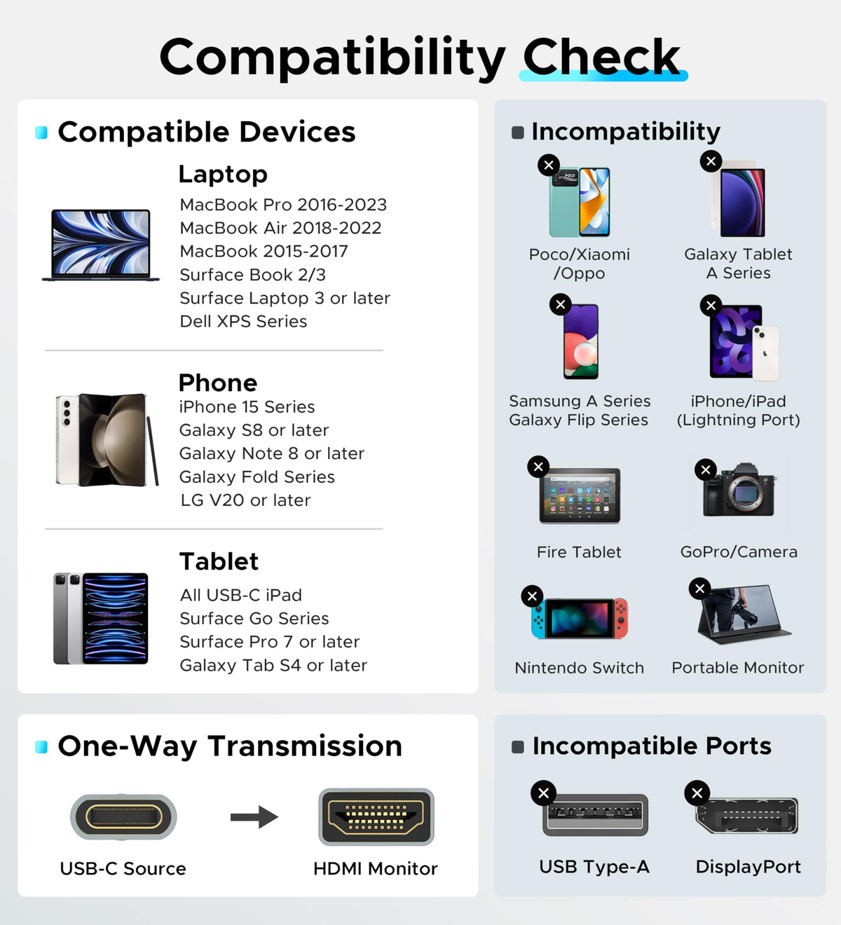 [Effortless Plug & Play] Crystal-Clear And Vibrant 4K@30Hz Resolution Backward Compatible For 1440P@60Hz And 1080P@122Hz. Instantly Mirror Or Extend Uhd Content From Your Type-C Phone, Tablet, Laptop, And Desktop Computer To Larger Displays Like Monitors, Tvs, And Projectors. Leave Behind The Worries Of Unstable Wifi And The Hassle Of Drivers. Hdcp Compliance Lets You Enjoy Media Streaming Without Any Limitations. *Note: One-Way Chord, Exclusively From Usb-C Host Devices To Hdmi Displays.