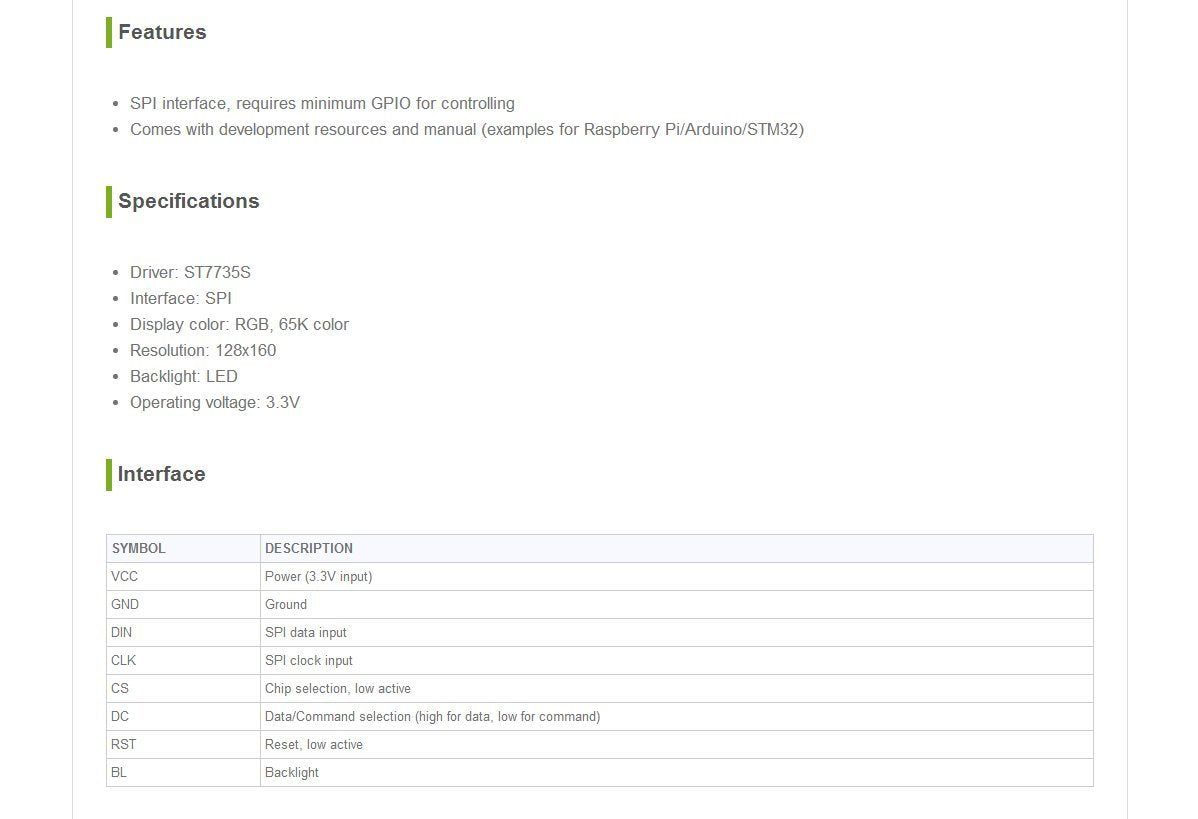 Q: What are the main features of the Waveshare 1.8inch LCD Display Module?A: The Waveshare 1.8inch LCD Display Module features a resolution of 128x160 pixels, an embedded controller for easy integration, and communicates via a four-wire SPI interface. It supports 65K RGB colors, operates on 3.3V/5V, and comes with comprehensive development resources and manuals for various platforms including Raspberry Pi, Jetson Nano, Arduino, and STM32.