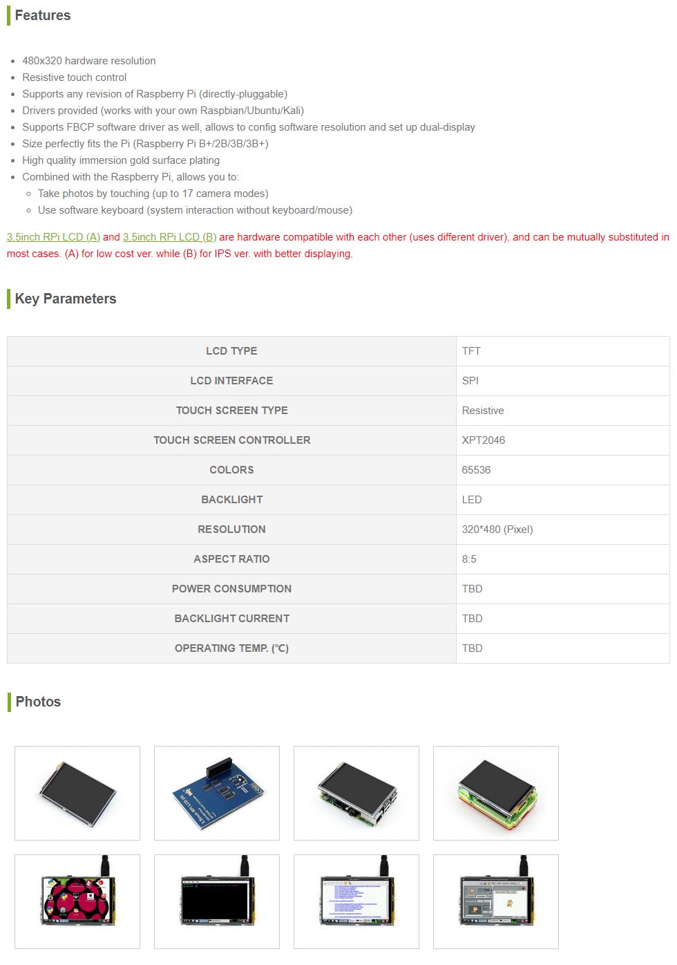 Features Designed For Raspberry Pi, An Ideal Alternative Solution For Hdmi Monitor Supports Any Revision Of Raspberry Pi (Directly-Pluggable) Drivers Provided (Works With Your Own Raspbian/Ubuntu/Kali) 320X480 Resolution, Better Display Convenient Men-Machine Interface For Raspberry Pi, Combined With The Portable Power, Diy Anywhere Anytime Supports Raspbian System, Enables Your System To: --Take Photos By Touching (Up To 17 Camera Modes) --Support Software Keyboard (System Interaction Without Keyboard/Mouse) High Quality Immersion Gold Surface Plating Package Content 3.5Inch Rpi Lcd (A) X 1 Touch Pen X 1 Rpi Screws Pack (2Pcs) X 1