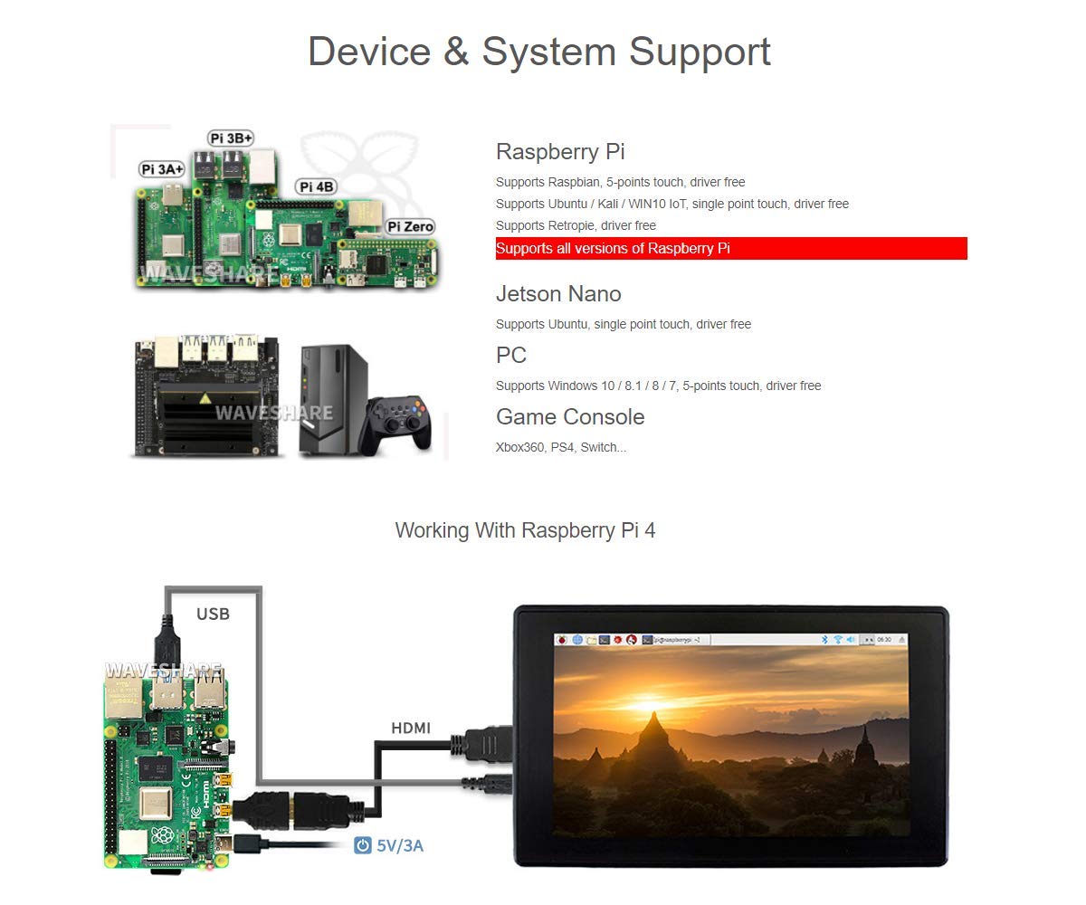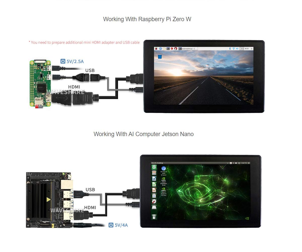 Overview 1024 600 Resolution, 7-Inch Capacitive Touch Screen Lcd Display, Hdmi Interface, Supports Various Systems. Toughened Glass Capacitive Touch Panel, 6H Hardness. It Supports Raspberry Pi ,Jetson Nano And Can Also Be Used As A Computer Monitor. Features 1.7Inch Ips Screen,1024X600 Hardware Resolution, Configurable By Software (Up To 1920X1080) 2.Toughened Glass Capacitive Touch Panel, 6H Hardness 3.Supports Popular Mini Pcs Such As Raspberry Pi, Bb Black, Jetson Nano,Banana Pi, As Well As General Desktop Computers When Works With Raspberry Pi, Supports Raspbian/Ubuntu/Kali/Retropie/Win10 Iot, Driver Free When Work As A Computer Monitor, Supports Windows 10/8.1/8/7, Five-Points Touch, And Driver Free 4.Multi Languages Osd Menu, For Power Management, Brightness/Contrast Adjustment, Etc. 5.3.5Mm Audio Jack, Supports Hdmi Audio Output 6.Also Supports Vga Input (Specific Cable Is Required And Should Be Purchased Separately) 7.High Quality Pc Case, Optional Tilt Angle: 30/50 Package Content 7Inch Hdmi Lcd (H) (With Case) X1 Hdmi Cable X1 Hdmi To Micro Hdmi Adapter X1 Usb Type A Plug To Micro B Plug Cable X1 Quick Start Sheet X1 Tips 1.If The Lcd Doesn'T Work Your Raspbian , Please Use The Lcd With The Raspberry Pi Official Image, Driver Should Be Installed First. Please Refer To The User Manual.However, For The First Testing, You May Want To Use Our Provided Image Directly. 2.Sometimes Lcd Will Flicker Because Of Undersupply From Usb Cable Of Pc. You Need To Connect An External Power Supply (5V/2A) To Dc Port.Note:Online Development Resources Are Provided,Please Contact With Us If You Need.