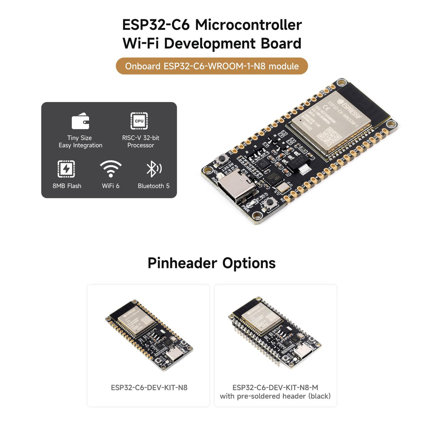 Specifications The Esp32-C6-Dev-Kit-N8 Is An Entry-Level Risc-V Microcontroller Development Board Integrating Wifi 6, Bt5 And Ieee 802.15.4 (Zigbee 3.0 And Thread). It Is Compact In Size And Powerful, With Multiple Peripheral Interfaces. Suitable For Smart Home, Industrial Automation, Healthcare, Consumer Electronics And Other Applications. Adopts Esp32-C6-Wroom-1-N8 Module, Which Is Equipped With Risc-V 32-Bit Single-Core Processor, Up To 160Mhz Main Frequency, Built-In 8Mb Flash; Integrates Rich Peripherals Including Spi, Uart, I2C, I2S, Led Pwm, Sdio And Other Interfaces; Onboard Ch343 And Ch334 Usb Hub Chips, Supports Usb And Uart Development At The Same Time Via A Usb-C Port. Compatible With The Pinout Of The Esp32-C6-Devkitc-1-N8 Development Board, More Convenient To Use And Expand A Variety Of Peripheral Modules. Comes With Online Examples And Tutorials For Esp-Idf Development Environment, So That You Can Easily And Quickly Get Started And Apply It To The Product.