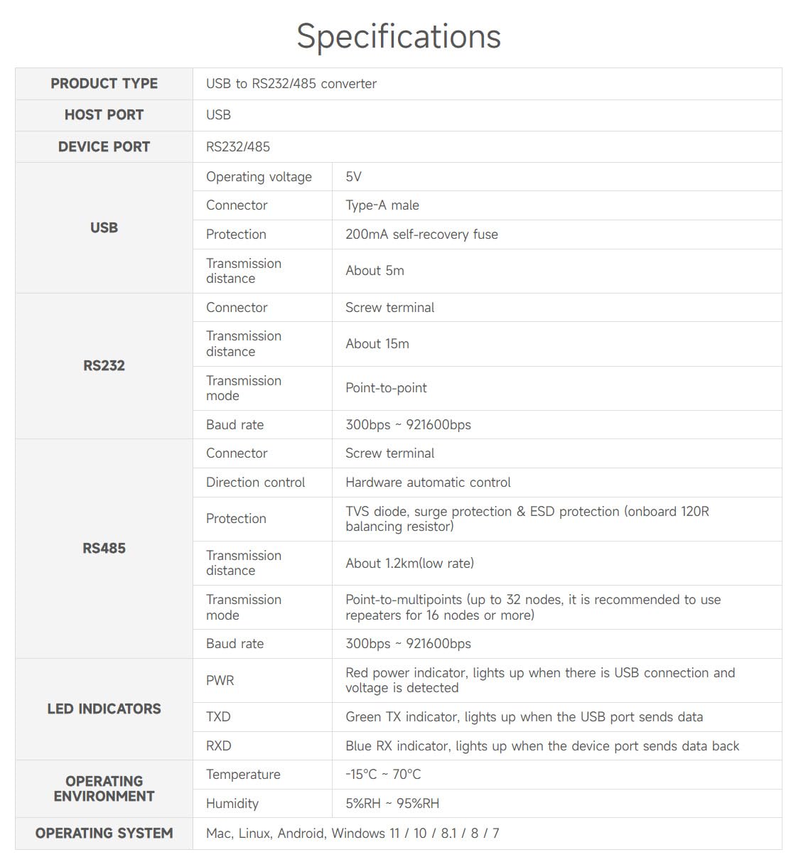 Q: What operating systems are compatible with the Waveshare USB to RS232/485 Serial Converter?A: The Waveshare USB to RS232/485 Serial Converter is compatible with multiple operating systems including Mac, Linux, Android, and Windows versions 11, 10, 8.1, 8, and 7.