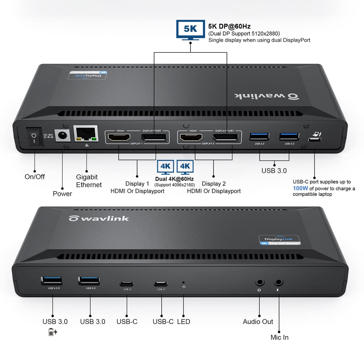 Wavlink 4K Universal Usb C Docking Station Dual Monitors, Displaylink Dock, 100W Pd Charging For Macbook M1/M2, Thunderbolt 4/3,