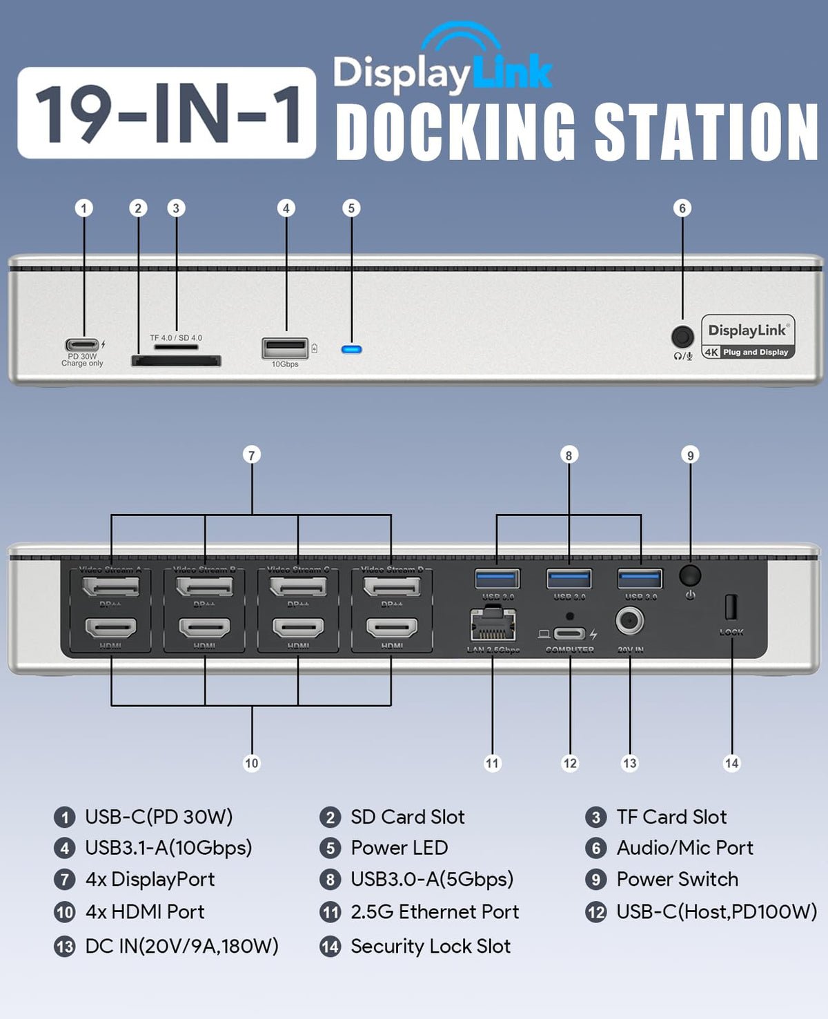 Universal Usb C Dock Quad Monitor 4K@60Hz With 100W Host Charging, 4� Hdmi, 4� Dp, 4�10Gbps Usb Ports, Tf 4.0/Sd 4.0 Card Reader, 2.5Gbps Ethernet, Quad 5K/4K @60Hz Display For Thunderbolt 3/4, Usb-C Windows And Mac