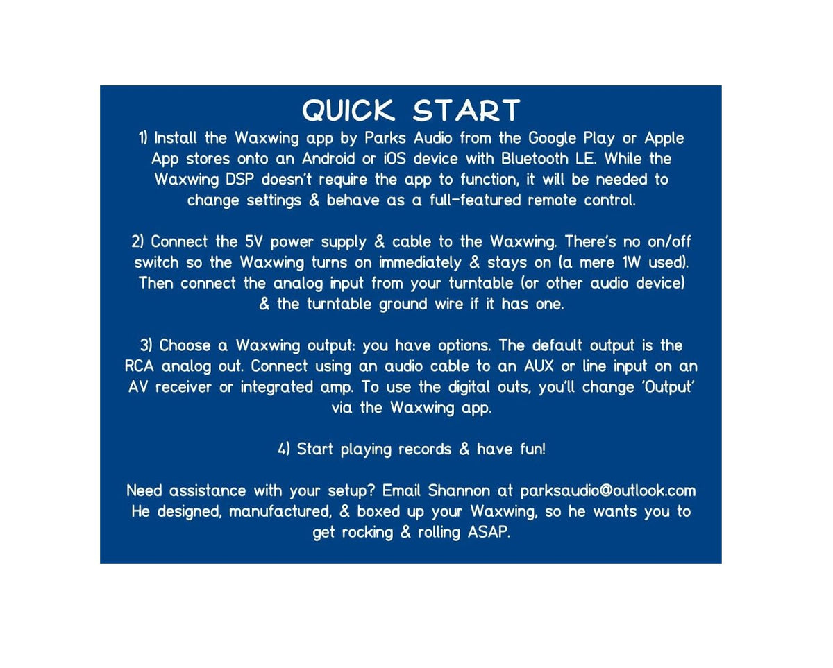 Q: What kind of support can I expect when purchasing the Waxwing Phono Preamp?A: Owners of the Waxwing Phono Preamp receive personalized email troubleshooting and advice directly from Shannon Parks, ensuring you have expert assistance to optimize your listening experience.