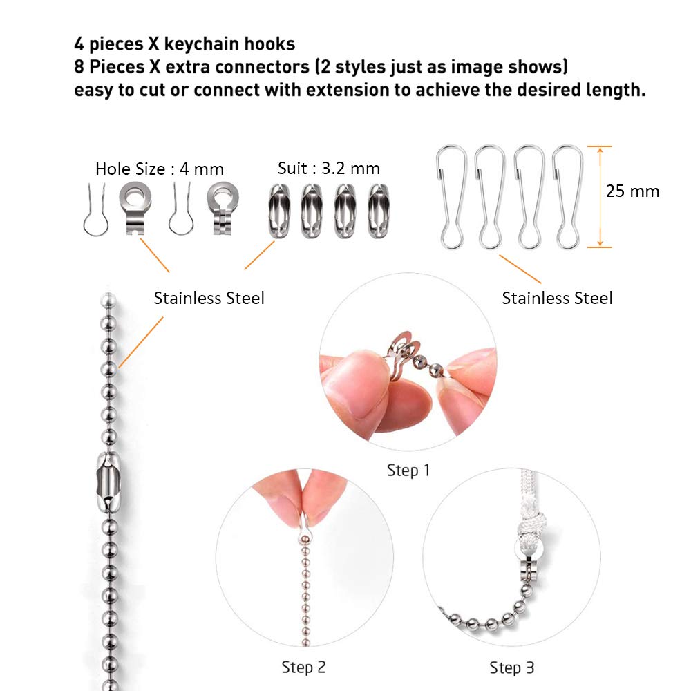 What You Get 4 Pieces X 35.4 Inches (90 Cm) Bead Pull Chains 4 Pieces X Keychain Hooks 8 Pieces X Extra Connectors (2 Styles Just As Image Shows) Specification: Color:Silver Chains, Silver Connectors And Hooks Material:All Stainless Steel Material Length Of Chains: 35.4 Inch Number Of Chains: 4 Pcs Diameter Of Each Bead: 3.2Mm Style Of Connectors: Pull Loop And Beaded Hole Size Of Pull Loop Connector: 4Mm Notice: 1. That Is Not Suitable For Replacing The Shutters Bead (4.5 Mm), Please Make Sure The Replacement Diameter Of Ball Size Pull Chain When You Buy It. 2.Our Guarantee, If You Are Not Satisfied For Any Reason, Just Return For A Refund Of Your Purchase Price, We Promise 24 Hours Customer Support, Please Feel Free To Contact Us For Any Product And Order Problem.