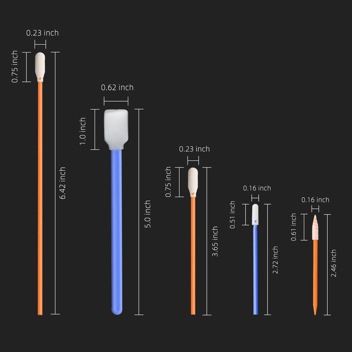 Q: What are the dimensions of Wellgler's foam cleaning swabs?A: Wellgler's foam cleaning swabs measure a total length of 5.1 inches (130mm), with a head length of 0.9 inches (24mm), a head width of 0.5 inches (12.7mm), and a head thickness of 0.34 inches (8.8mm).