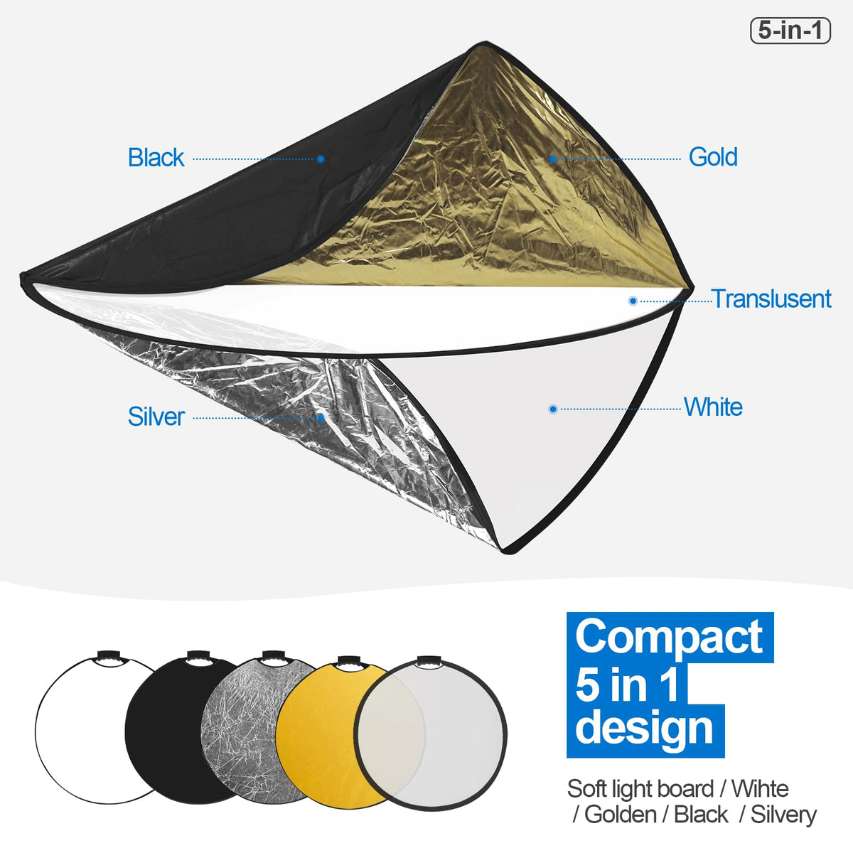 Wellmaking 32Inches/80Cm Photography Light Reflector, Portable Foldable 5 In 1 Diffuser Reflectors With Bag & Tilt Adapter For Studio & Outdoor Lighting-Translucent, Silver, Gold, White And Black ?Easy To Use?Within Two Comfortable Grips On The Reflector, Allowing You To Use It With Just One Hand. Provide Better Experience Than Traditional Reflector. The Handle Features An Additional 1/4''-20 Threaded For Attachment To Accessories Or Grip Equipment. ?High-End Reflective Coating?The Reflector Features High-End Reflective Coating Multi High Quality Layer And Raised Grain Design. With High Reflectivity And Even Reflection. It Allows You To Quickly And Easily Make Adjustments To Your Lighting In Order To Get The Look You Want. ?With A Hand Grip And Tilt Adapter?Easy To Hold In Hand To Use For Your Photography, The Reflector Comes With A Tilt Adapter. The Handle Features An Additional 3/8''-16 Threaded For Attachment To Accessories Or Grip Equipment. The Duty Tilt Adapter Can Secure The Reflector With Extraordinary Strength. With This Angle-Adjustable Stand Mount Adapter, It Can Use With Any Situation, Portrait, Live Streaming, Video Lighting And Etc . ?Portable & Durable? Folded Size Only 12 Ines, With A Portable Case, Suitable For Travel Or Storage. Suitable For Outdoor Photography Activities. ?After-Sale Service?We Guarantee To Our Customer Who Purchase Our Product, We Will Provide 1 Year After Sale Service. On The Other Hand, If You Have Any Suggestion Or Question, Please Feel Free To Talk To Us, We Are Willing To Hear Your Advise And Concern.