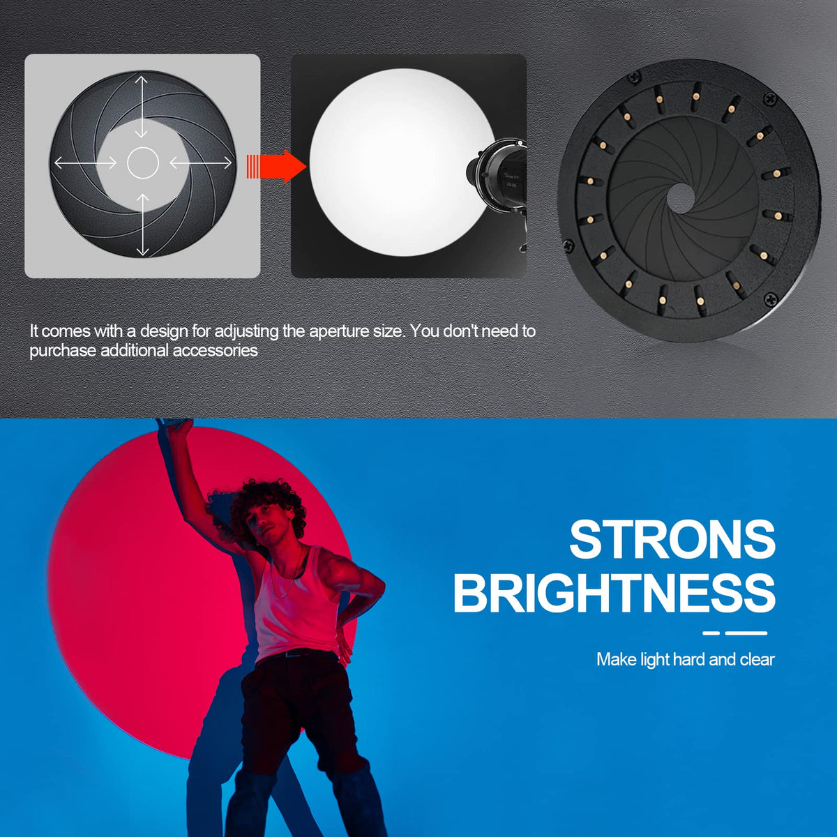 [Casual Creation ]:Gobos And Color Gel Could Be Used Together,Also Could Use Alone To Achieve Special Light Effects.Providing More Abundant Resources For Creative Shooting.[Multi-Function]:Firstly Focus Ring Design Can Make Projection Clear.And Another Important Function Is That You Can Get The Projection From Spot To Wide By Manually Change The Aperture Size.Very Suitable For Photographers To Shoot Portrait And Products.[Compatibility]:Original Designed With Bowens Speedring,Could Replaced By Profoto Speedring Or Elinchrom Speedring.Changeable Chucks With Various Bayonet. The Size Of The Chuck Is 152Mm.[Widely Used]:Premium Material Made Of Metal,Gobos Are Also Made Of Stainless Steel And High Temperature Resistance.Suit For Almost All Powerful Led And Strobe Flash Light On The Market.(It Is Recommended Not To Use The Modeling Light For A Long Time In Use To Prevent High Temperature From Damaging The Lens)[Kit Include]:1*Optical Snoot,1*Bowens Speedring,1*Gobo Holder, 6*Stainless Steel Gobos, 4*Color Gel(Red/Yellow/Green/Blue).Attention!!Strobe Falsh Light?Profoto Speedring And Elinchorm Speed Ring Need To Be Purchased Separately.